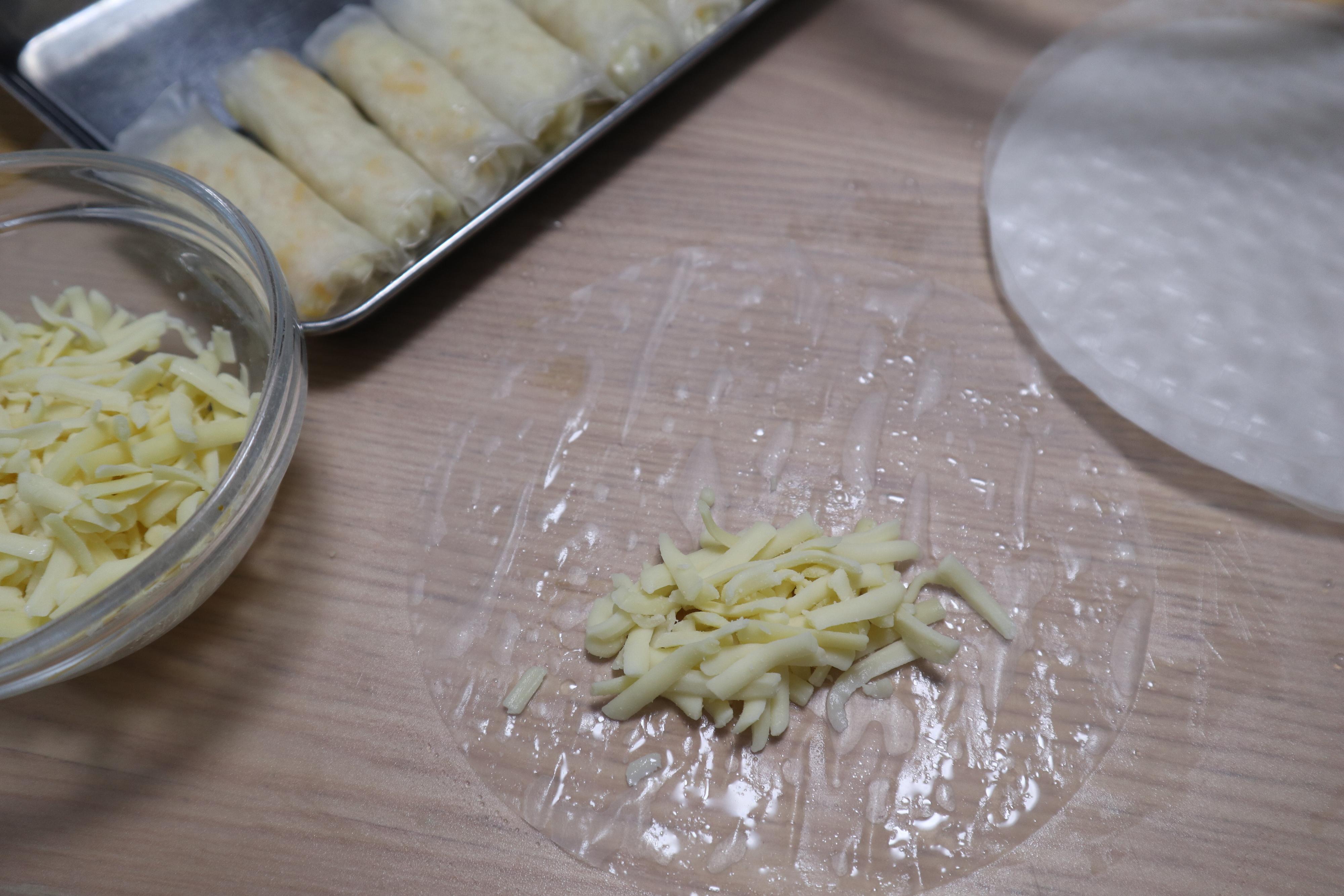 お湯で戻したライスペーパーにとろけるチーズ大さじ1をのせて包んだものを15本ほどつくります。お湯に少しサラダ油をたらしておくとライスペーパーがくっつかないのでおすすめです。