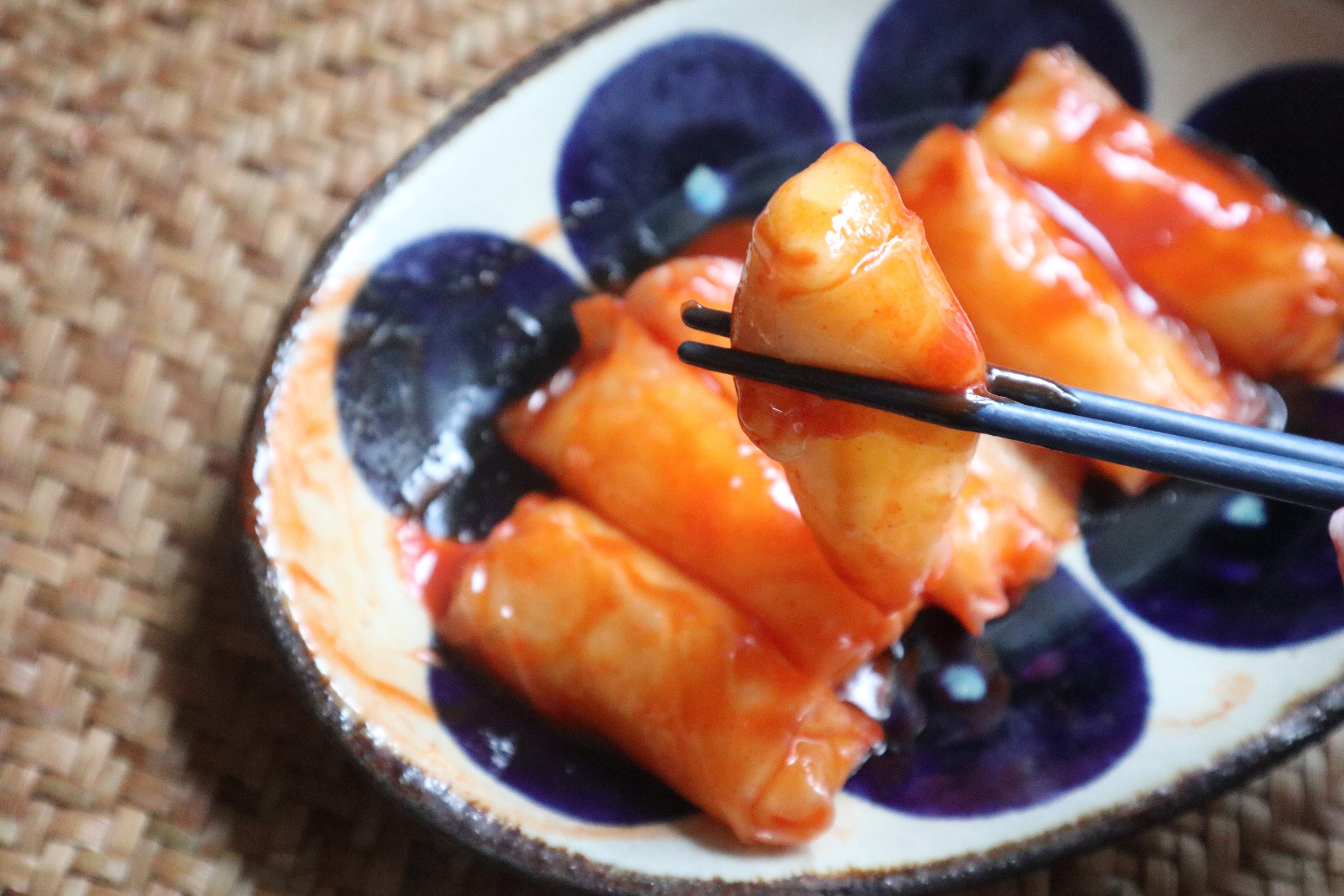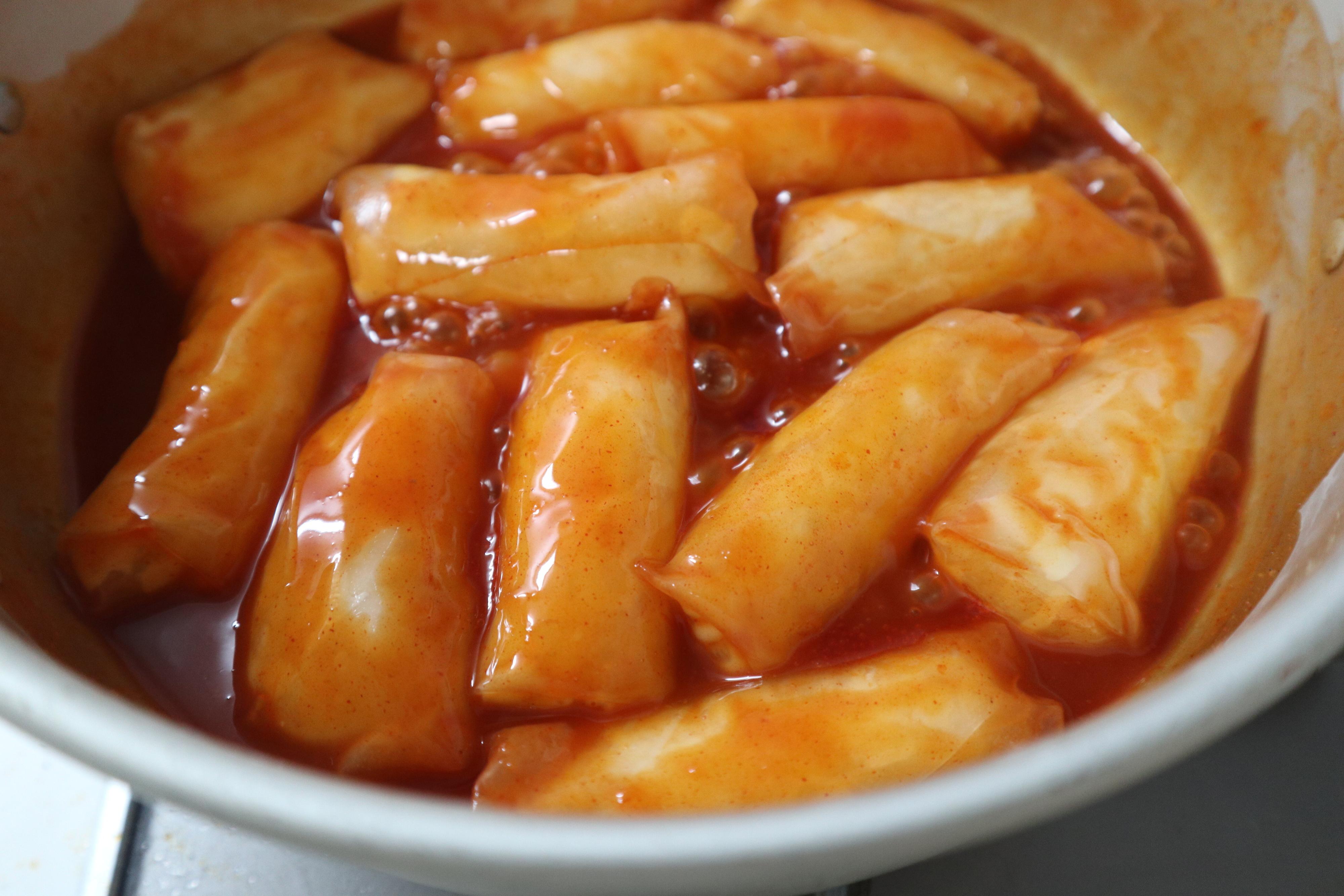 ライスペーパートッポキの完成です。今回紹介した調味料の中では、コレがいちばん辛めです。甘めのピリ辛ソースがもちもちライスペーパートッポキにからんでたまりません。
