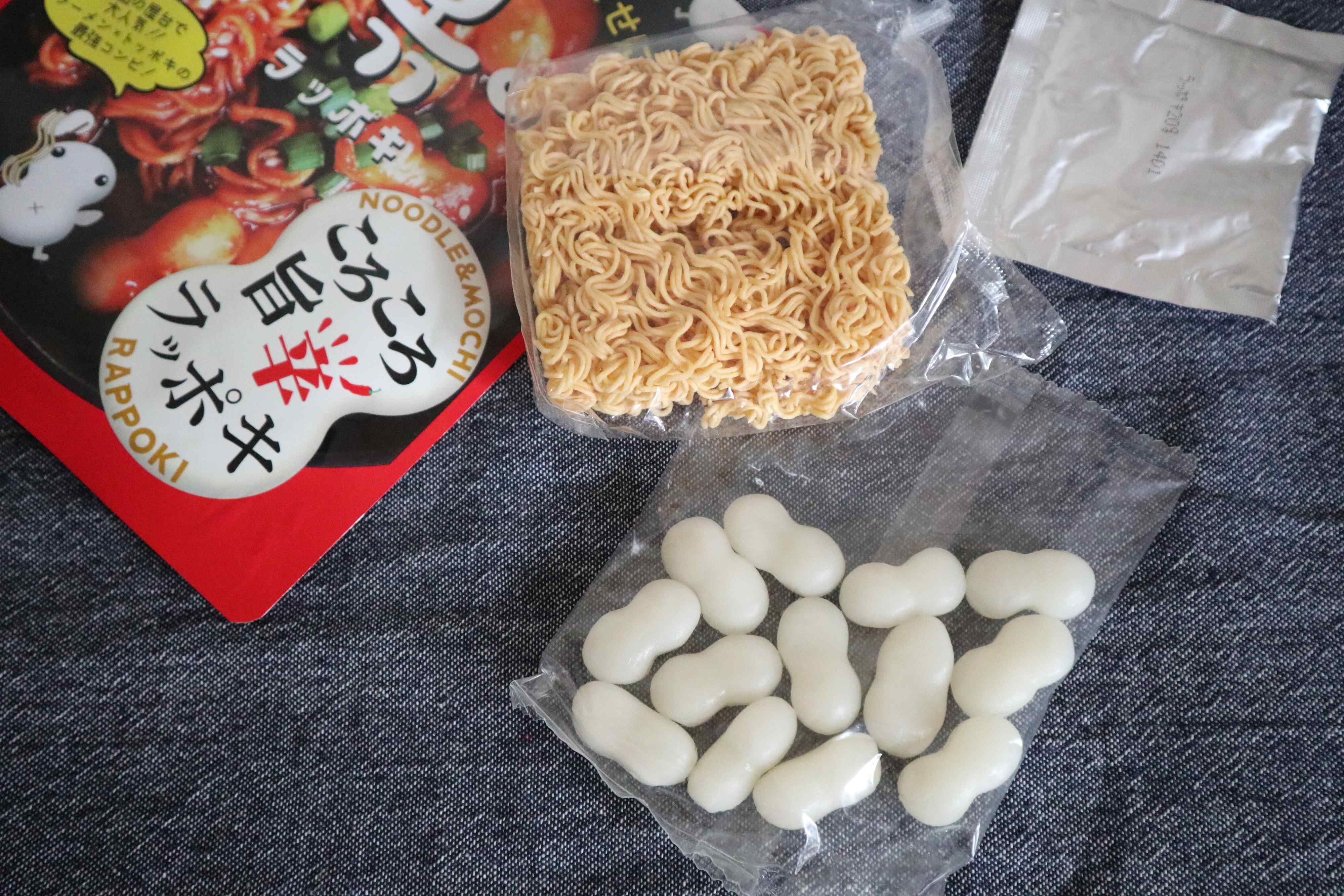 1袋の中身は、揚げ麺、トッポギ、甘辛ソースの粉。トッポギには国産米が使用されています。