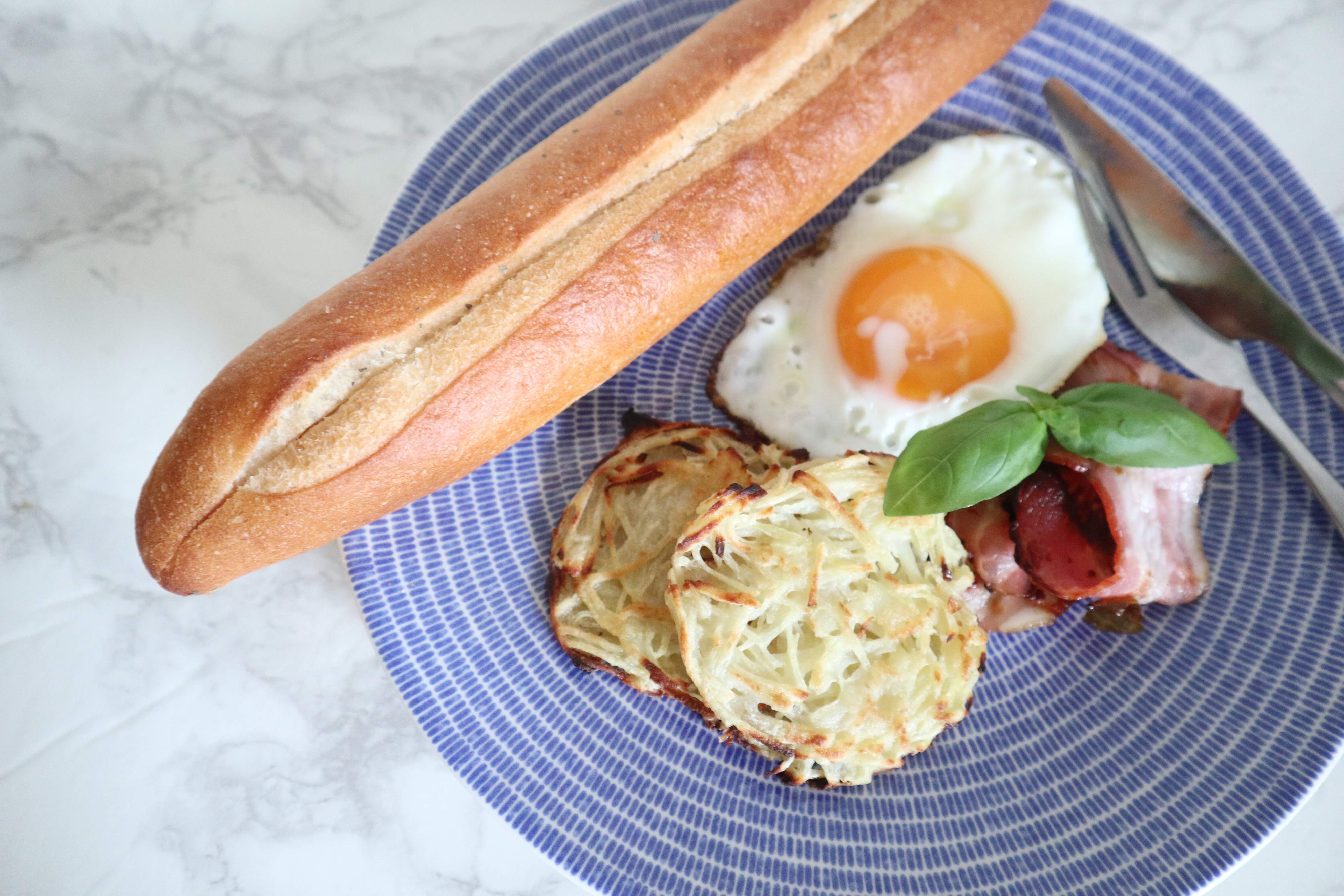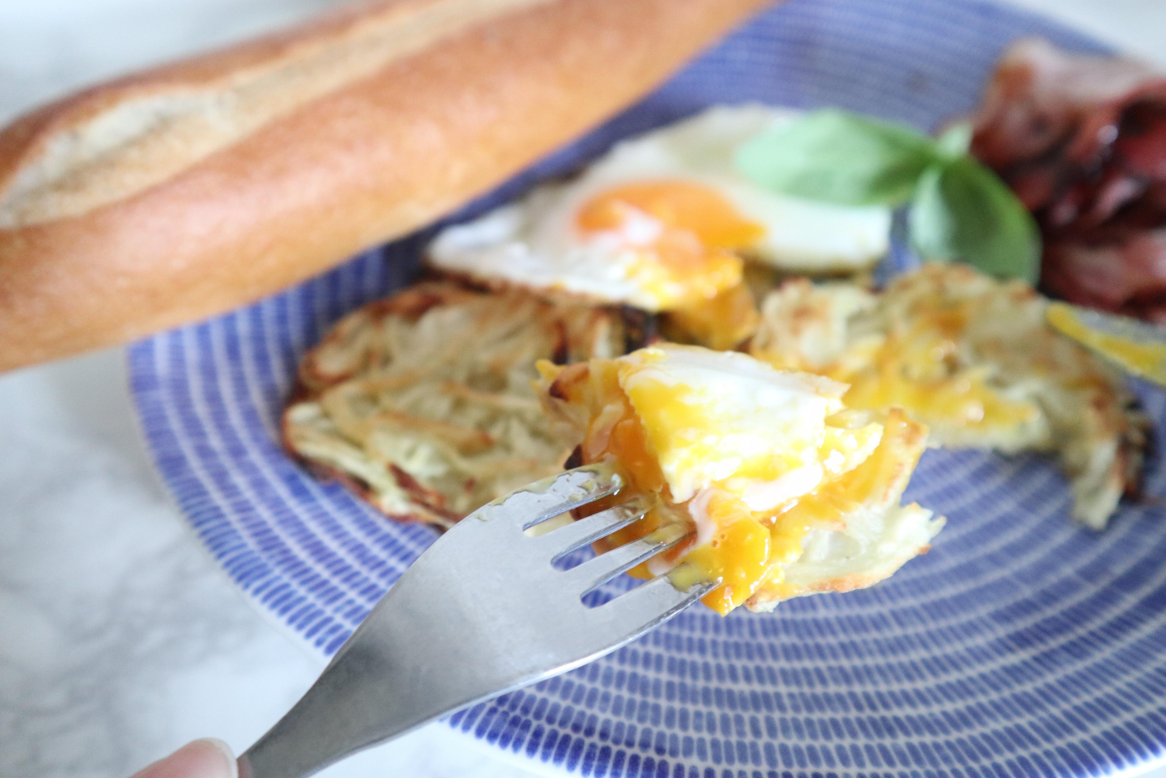 そのまま食べてもいいのですが、ロスティと半熟の目玉焼きをからめて食べるのがお手軽ながらとってもおいしいからおすすめ。お好みで塩とブラックペッパーをふっても〇。海外の雰囲気を味わえる朝食になりますよ。