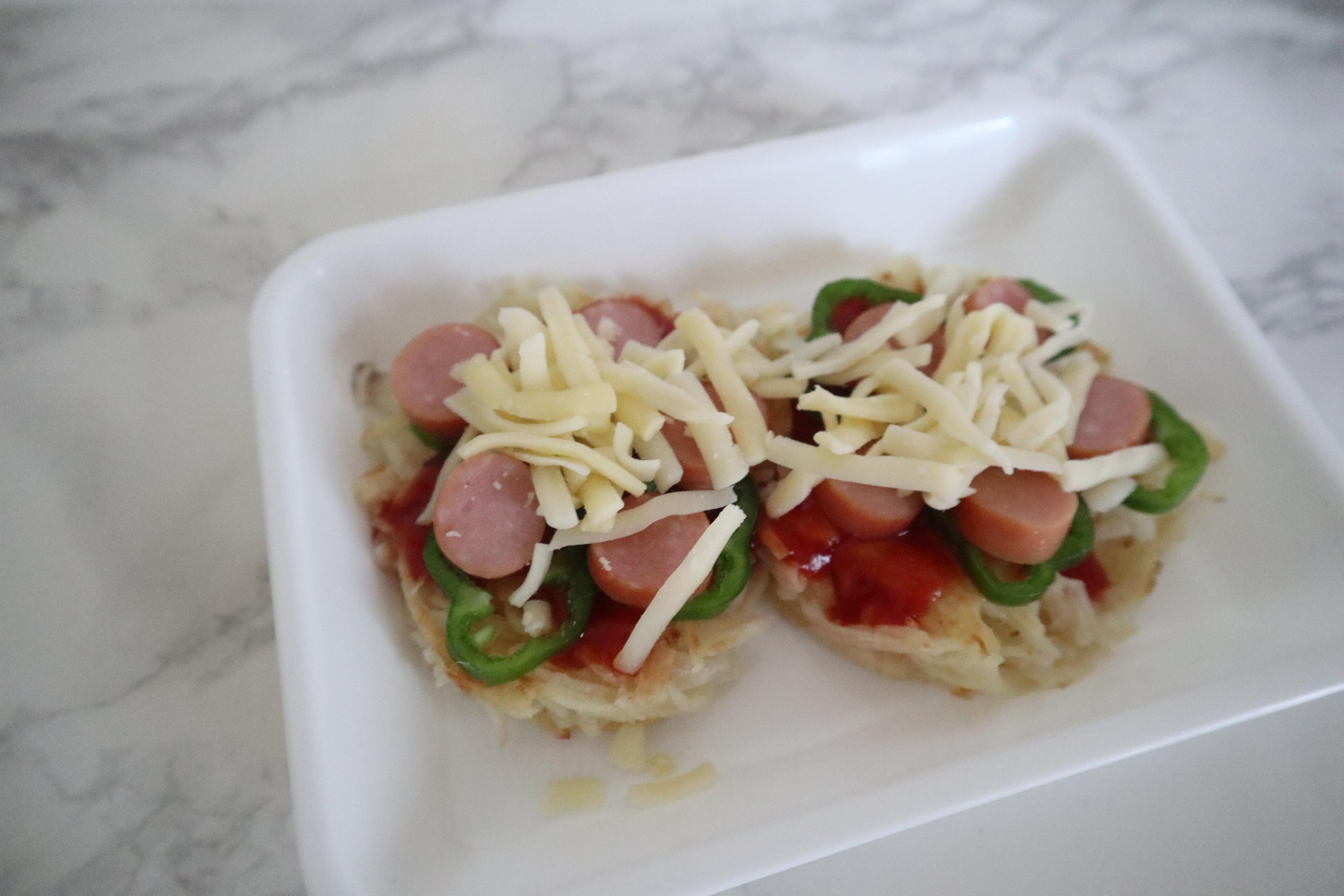 【1】室温で解凍したロスティにケチャップ、ピーマン、ウィンナー、ピザ用チーズをお好みの分量のせる。