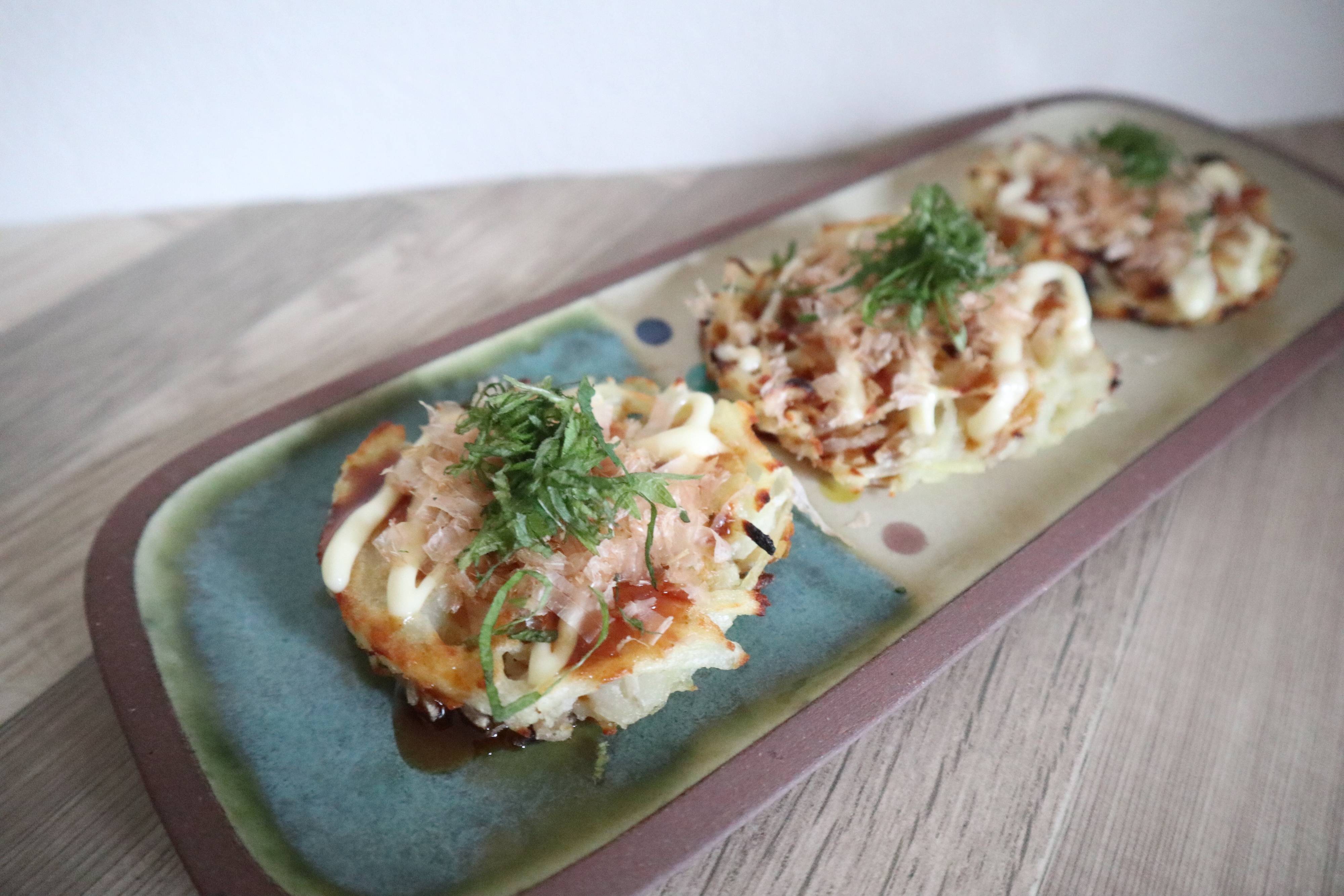 オーブントースターで焼いたロスティにソース、マヨネーズ、鰹節、大葉をのせれば完成!すごくカンタンにつくれるのに、おいしすぎて感激しちゃいました。お手軽なのでおやつにつくるのもおすすめです。