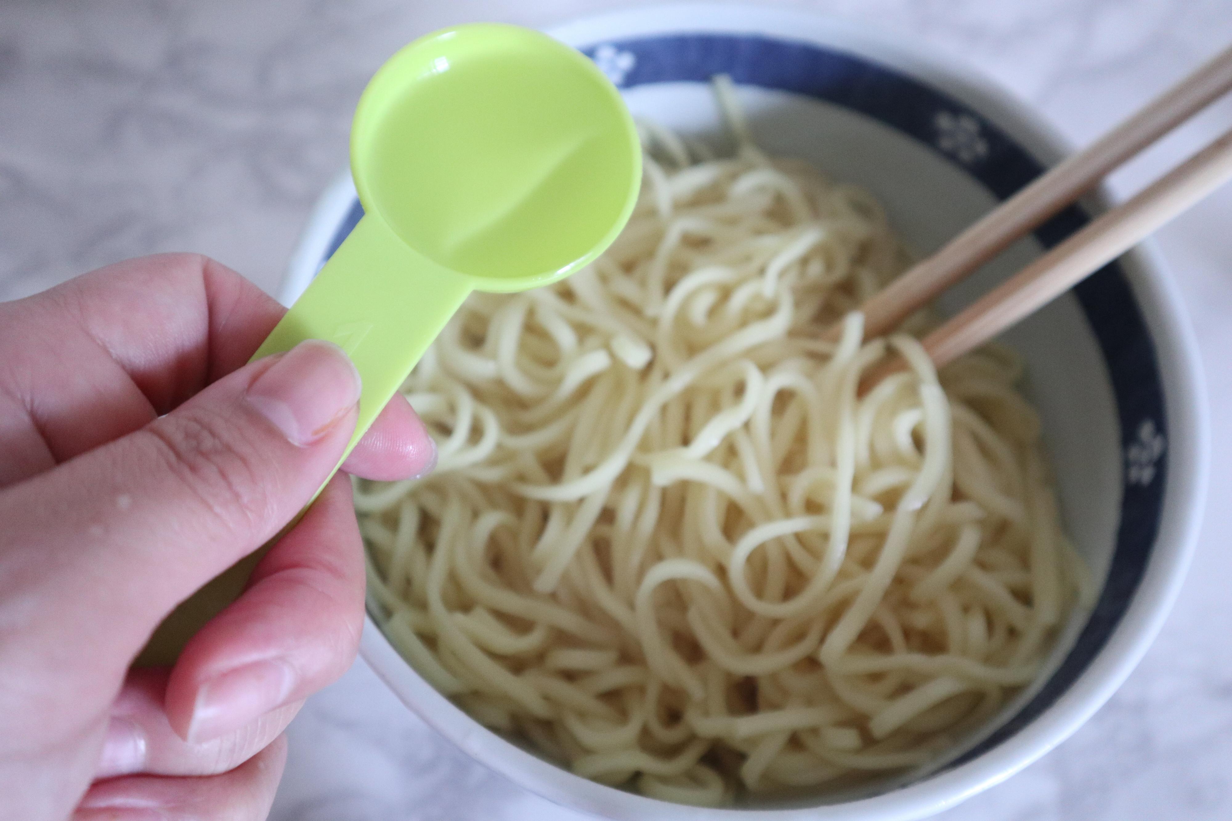 今回は、2人前を作る時の作り方でご紹介します。まず、麺を4分茹でたらサラダ油を大さじ1かけ混ぜます。