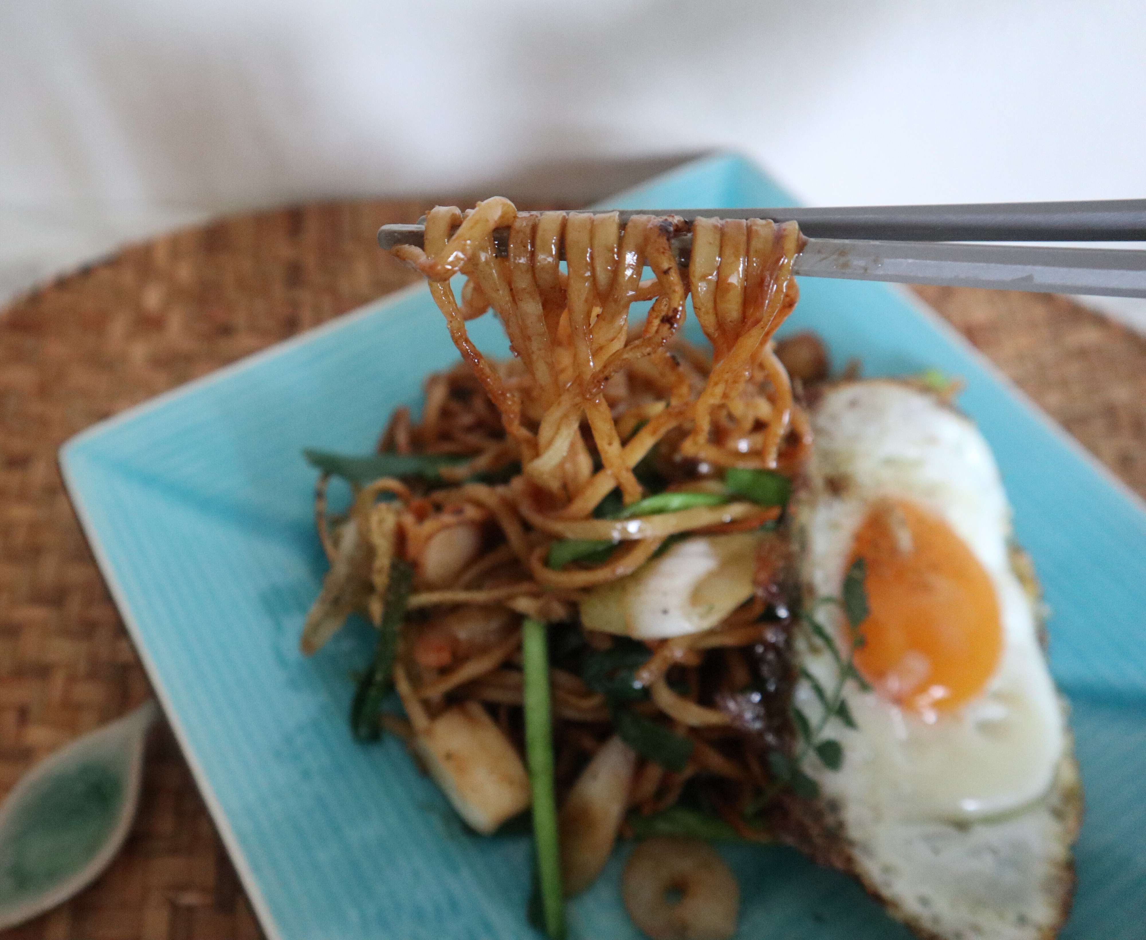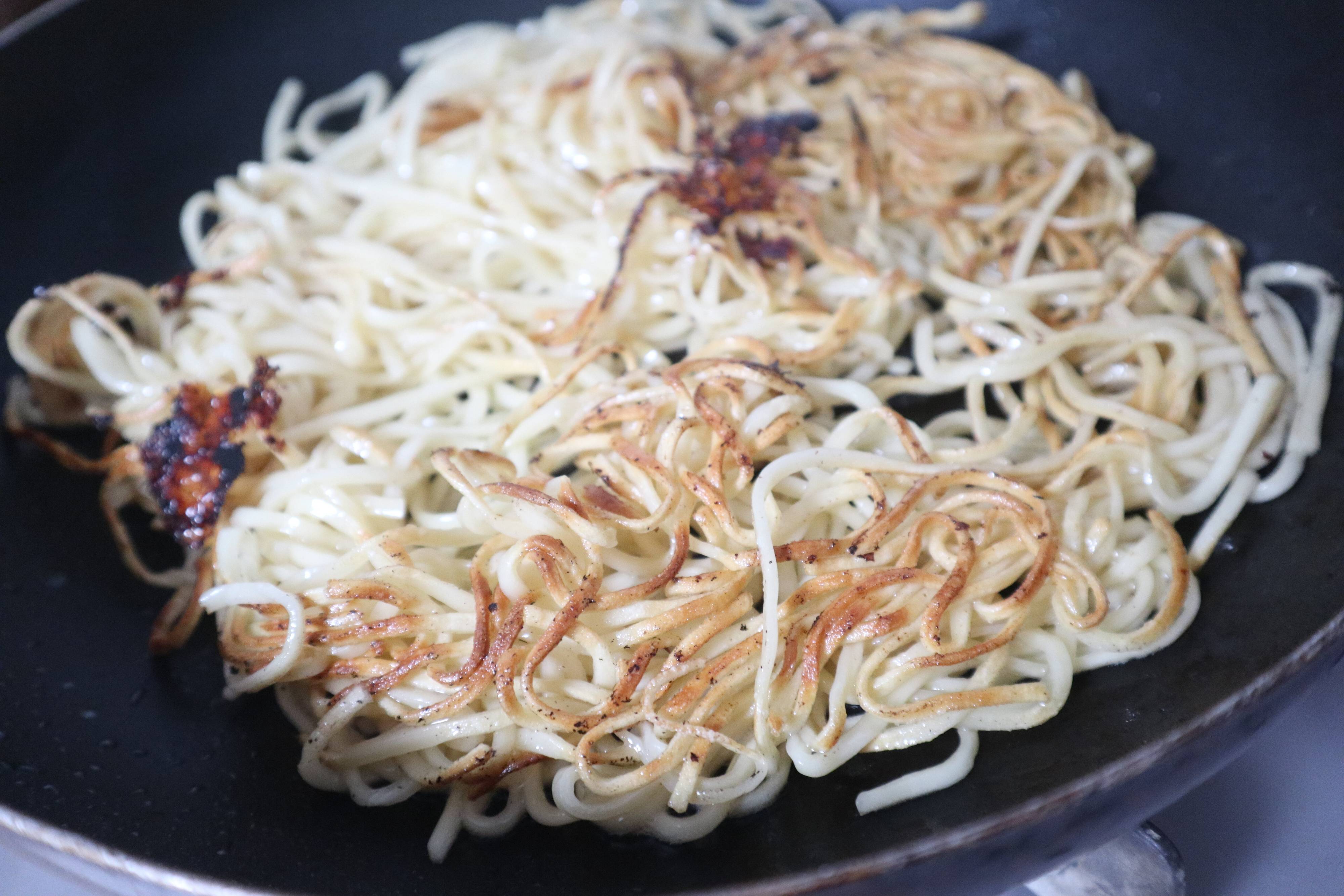 面倒ですが、麺をカリカリ香ばしく焼いておきましょう。これをすることでおいしさがグーンとアップするので、このひと手間を入れてください。