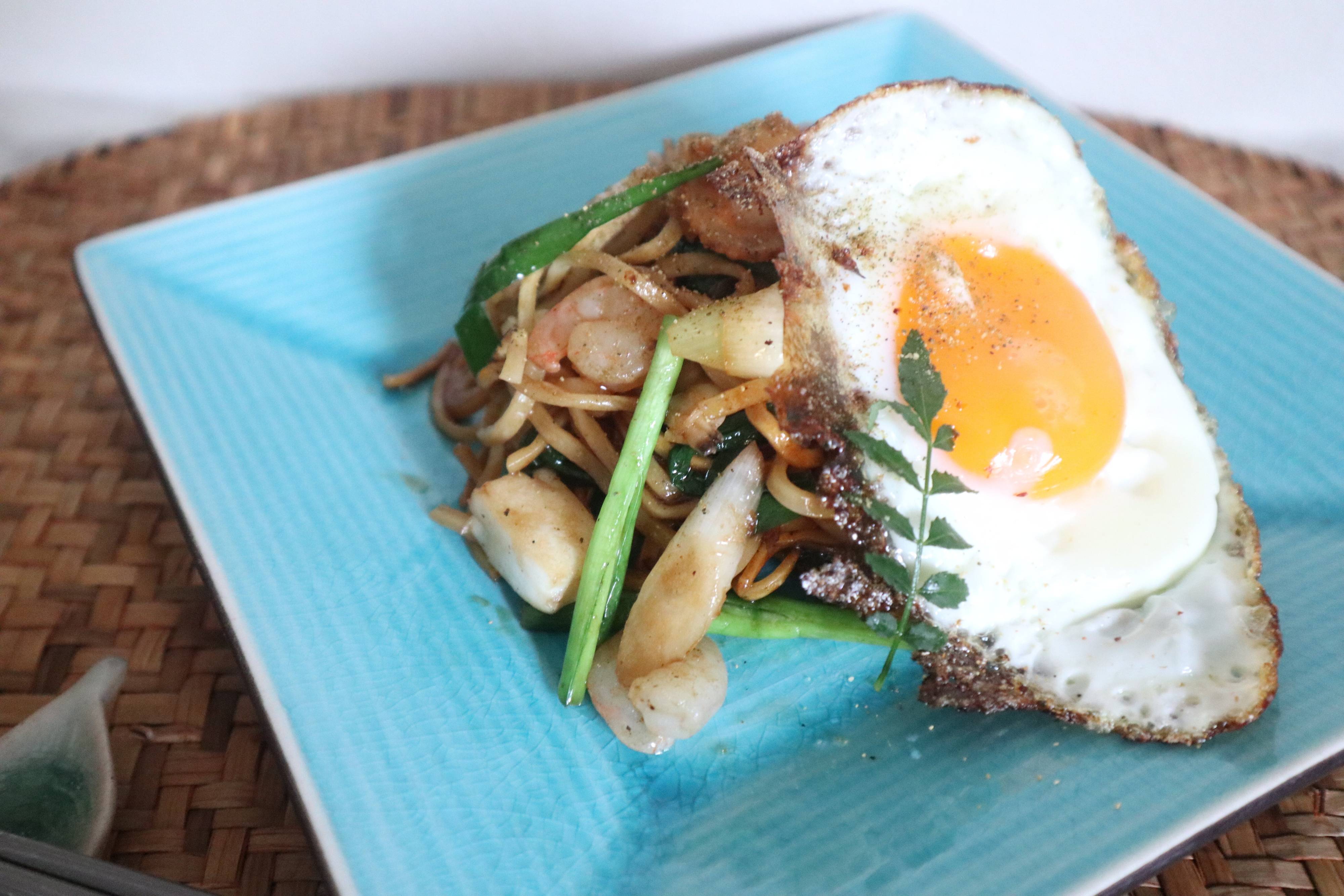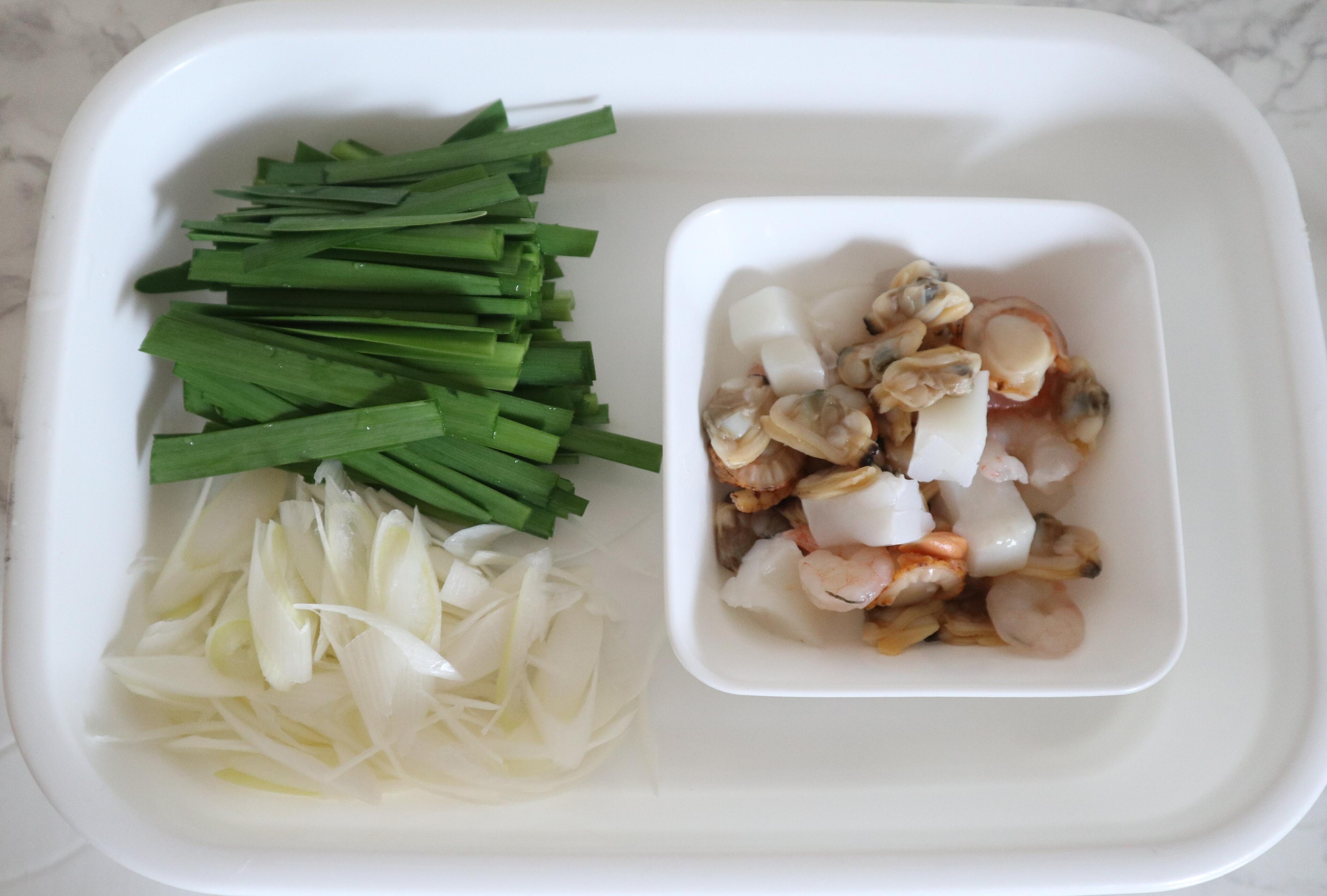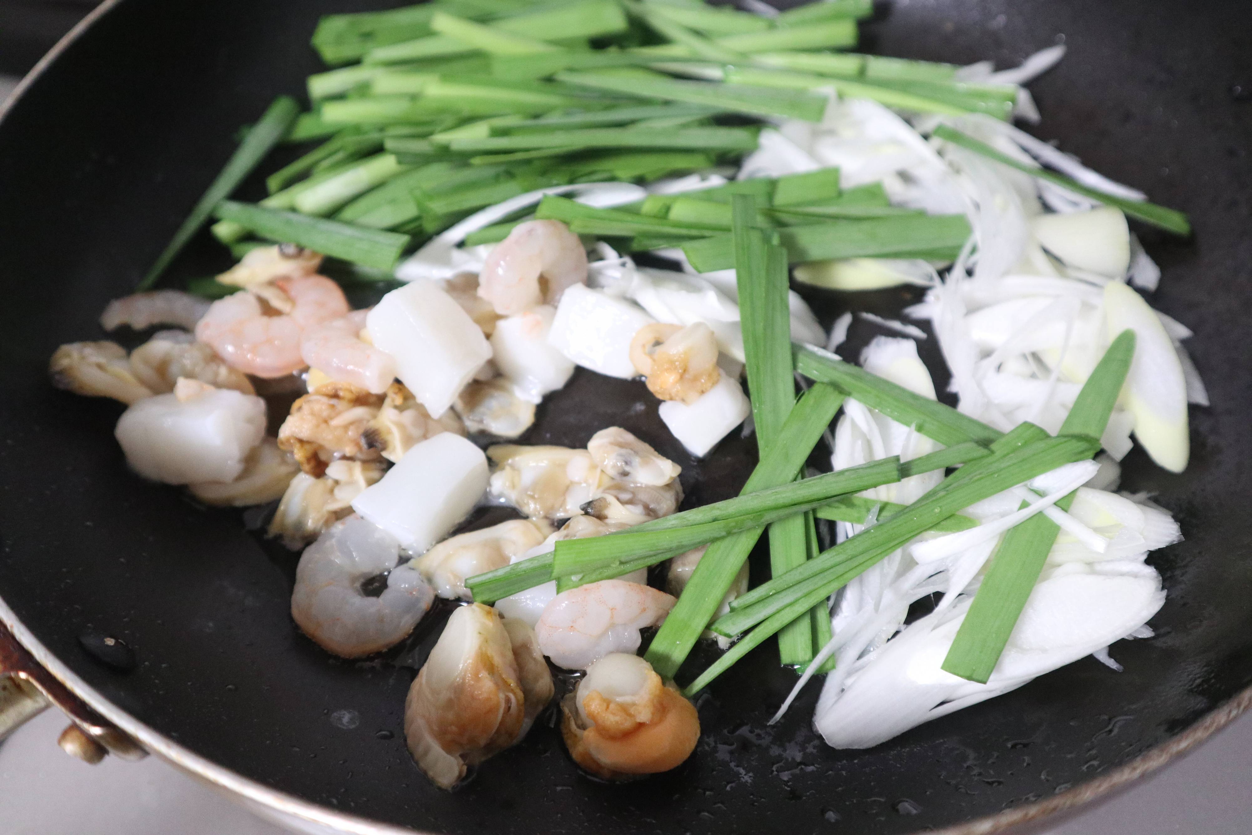 フライパンにサラダ油大さじ1を加えて具材を炒める。長ネギがくたっとしたら、麺を加えて炒めます。シーフードミックスは、あまり炒めすぎると小さくなってしまうので、要注意です。