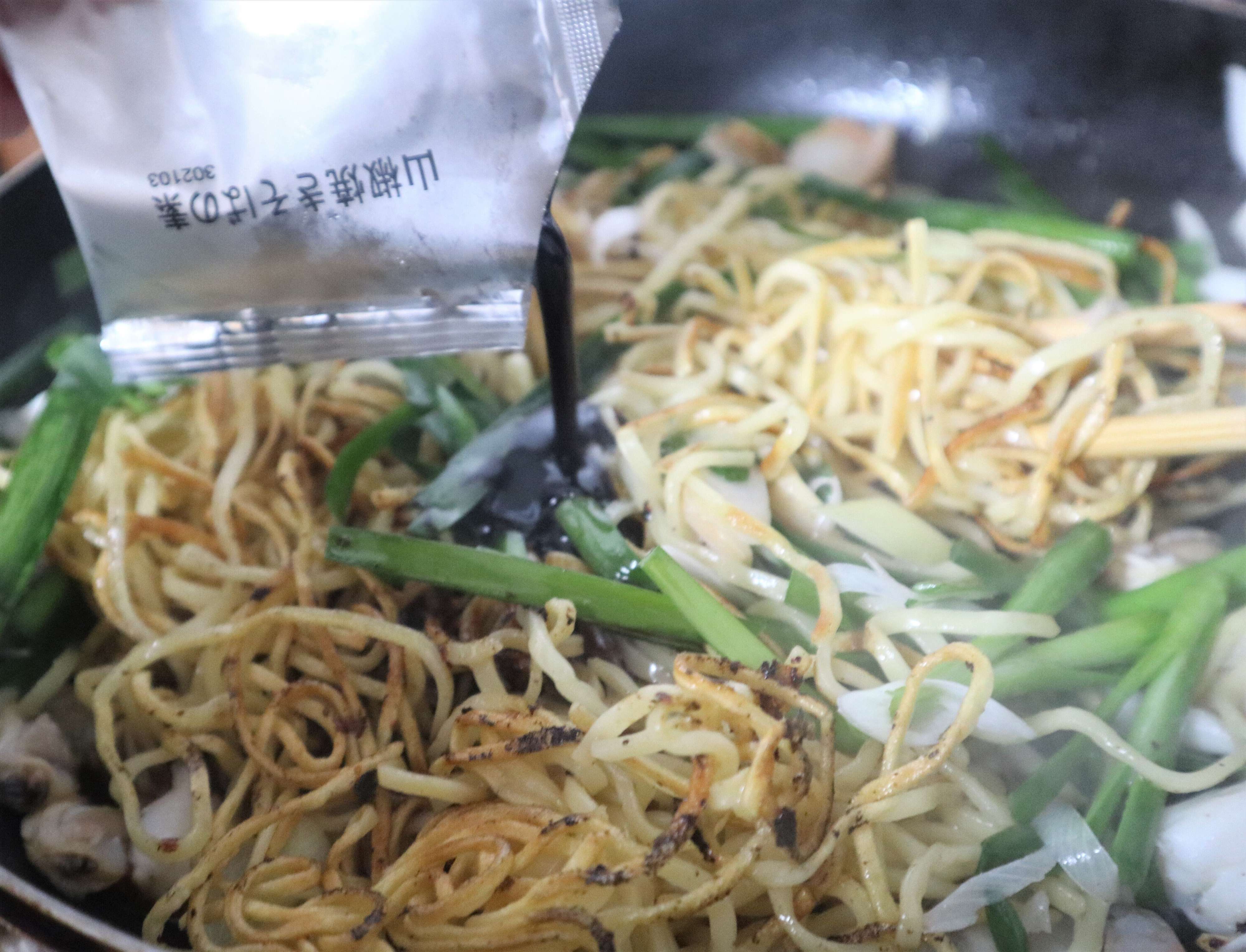 山椒の焼きそばの素を加えて、炒めます。いい香りが漂ってきて、食欲をそそります。