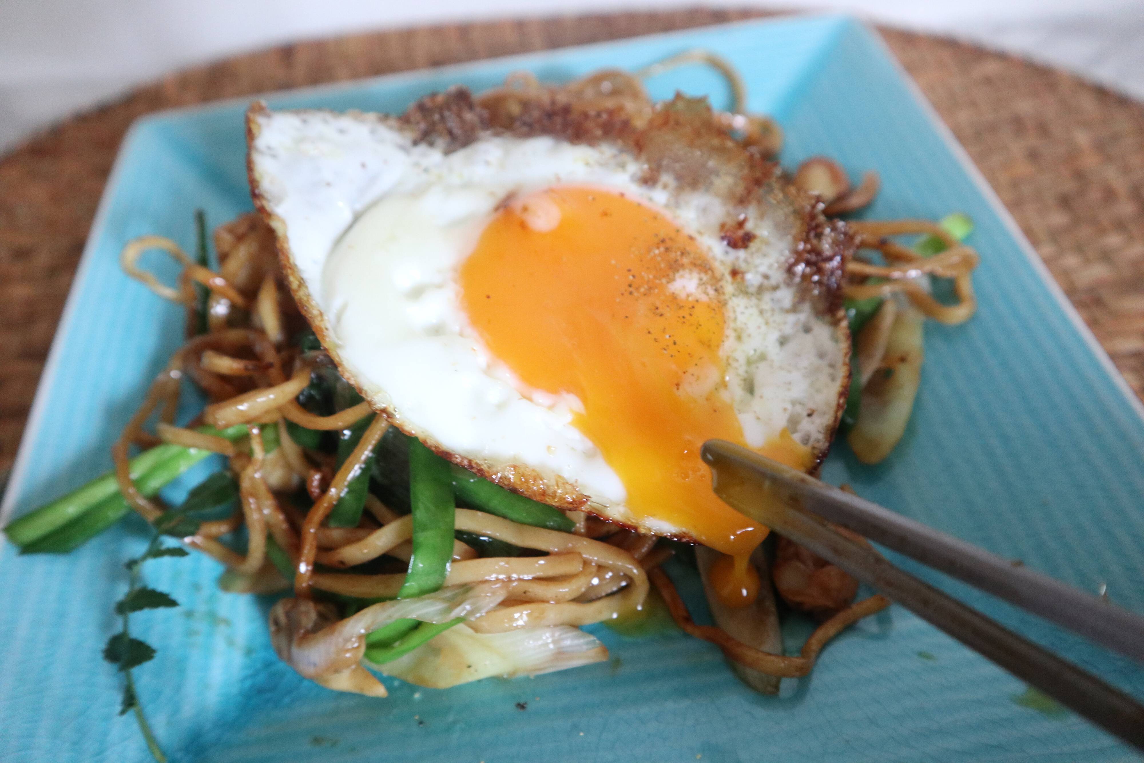 焼そばを器に盛り目玉焼きをトッピングしたら、あとがけ山椒をぱらり。「山椒焼きそば」の完成です。いつもの焼きそばよりご馳走感がありますね。