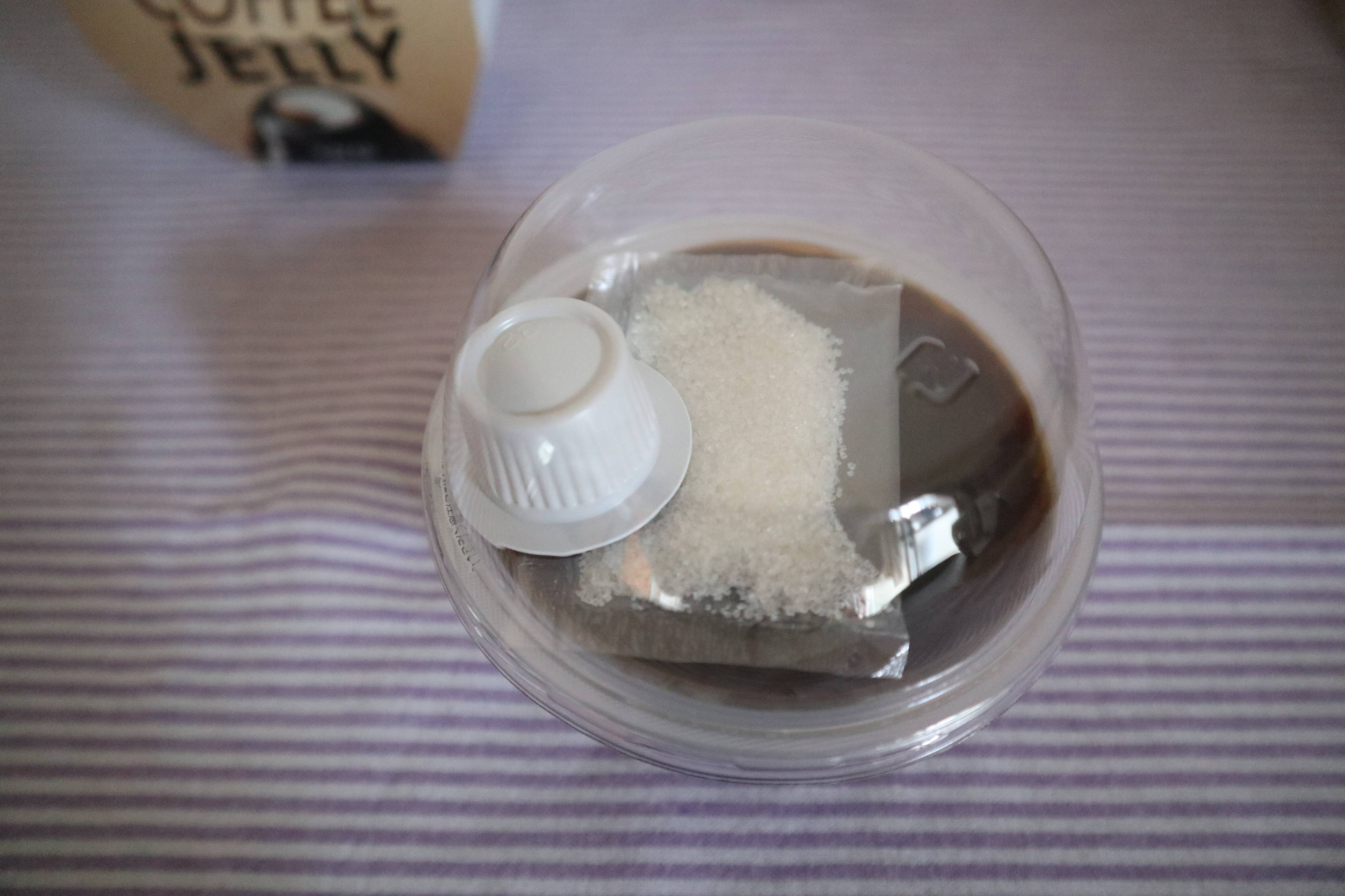 内容は、コーヒーゼリーたっぷり205gとコーヒーシュガー、コーヒーフレッシュがついてきます。