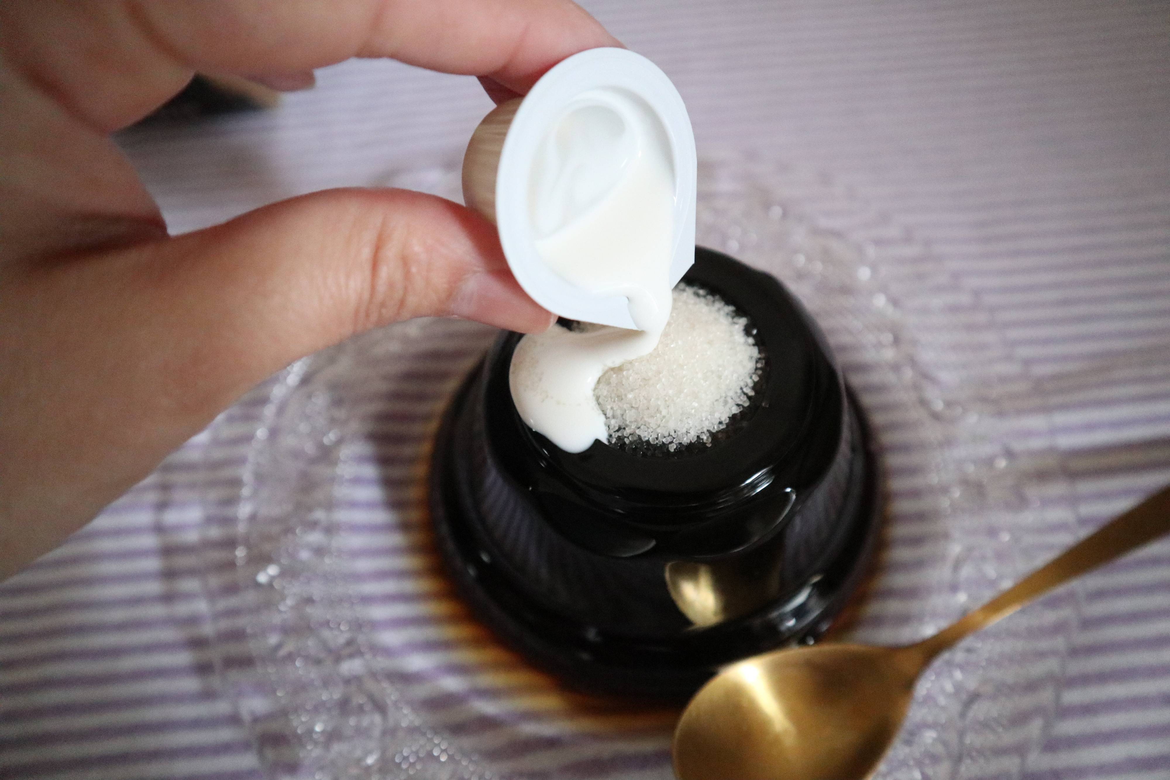 コーヒーシュガーの上からミルクをたっぷりかけます。