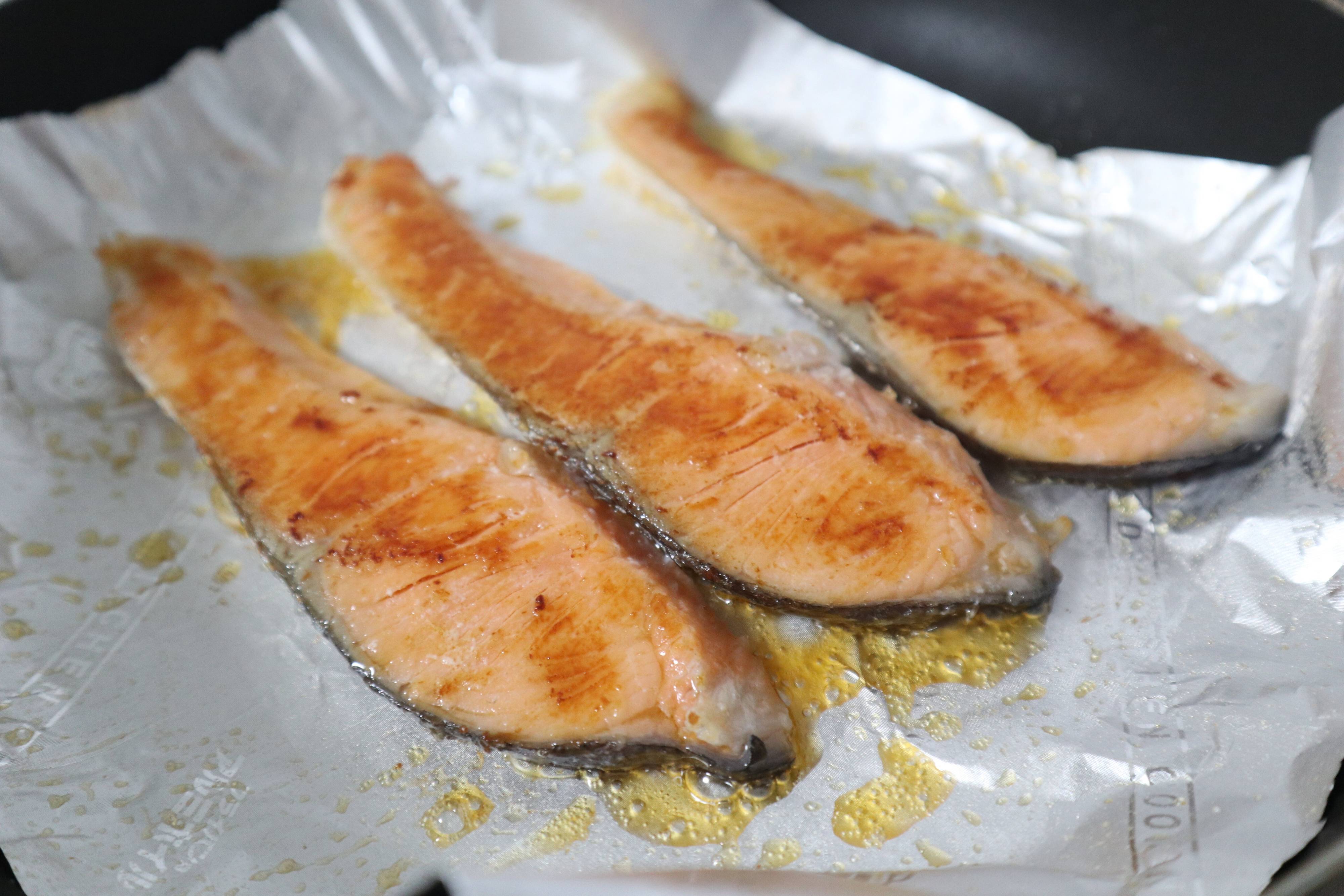 鮭の塩焼きもフライパン用アルミホイルを使って焼くと、くっつきにくいのでふっくらきれいに仕上がります。魚焼きグリルで焼くとそのあとの片づけが厄介ですが、これだとその負担も軽減。