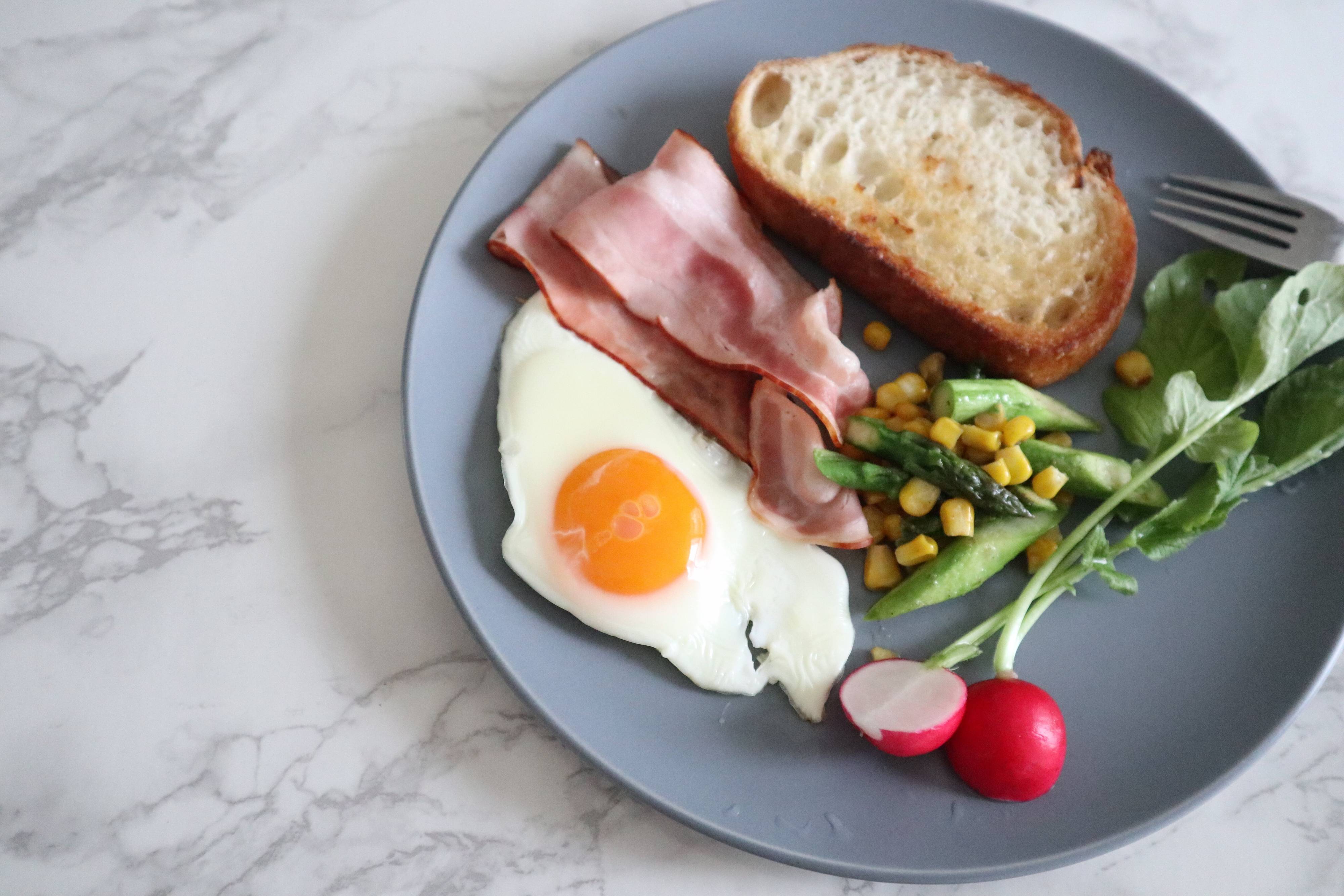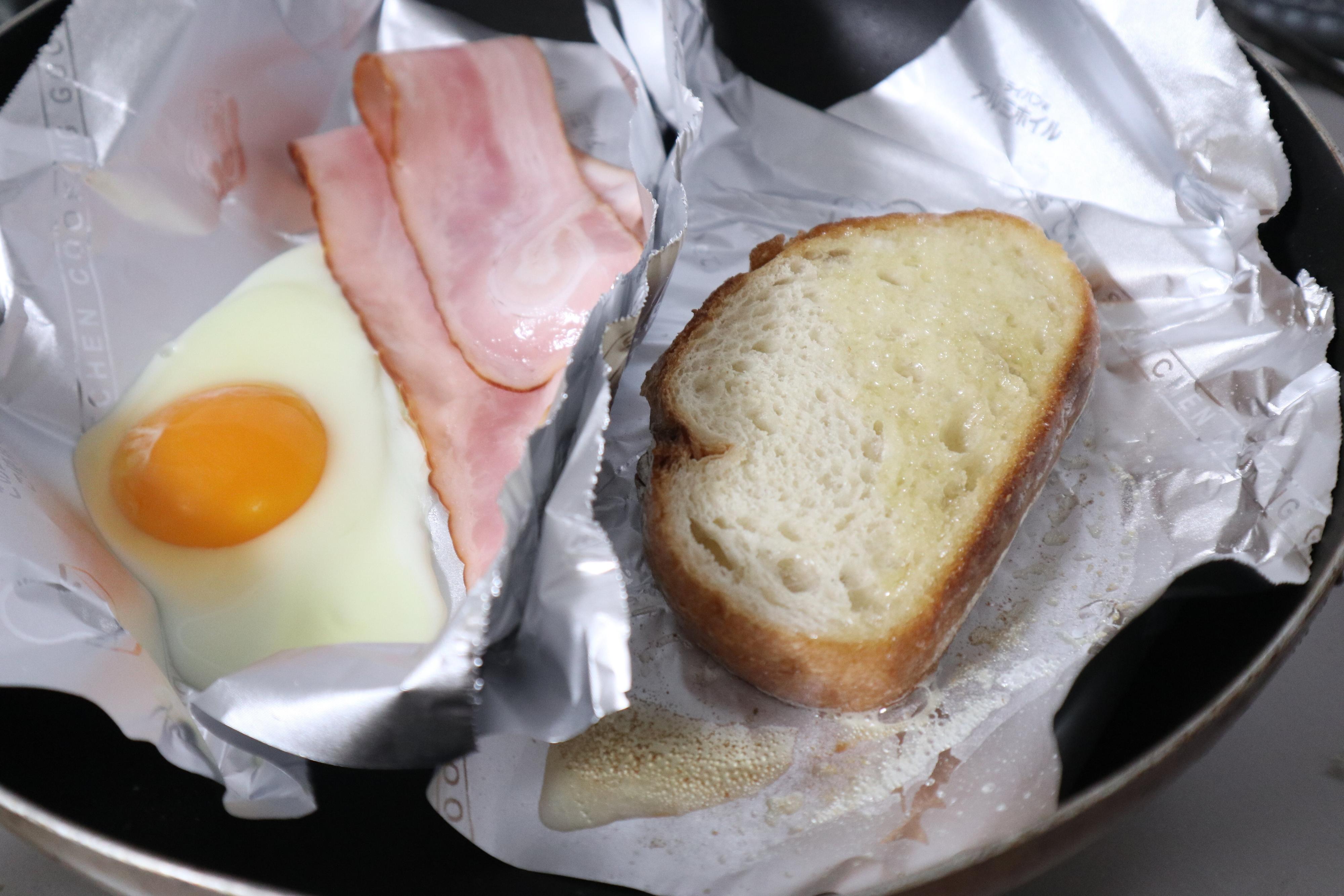 このアルミホイルはくっつきにくいので、ベーコンエッグは油をひかなくてOK。カロリーもオフできます!その横で、バタートーストもいっしょに焼いています。