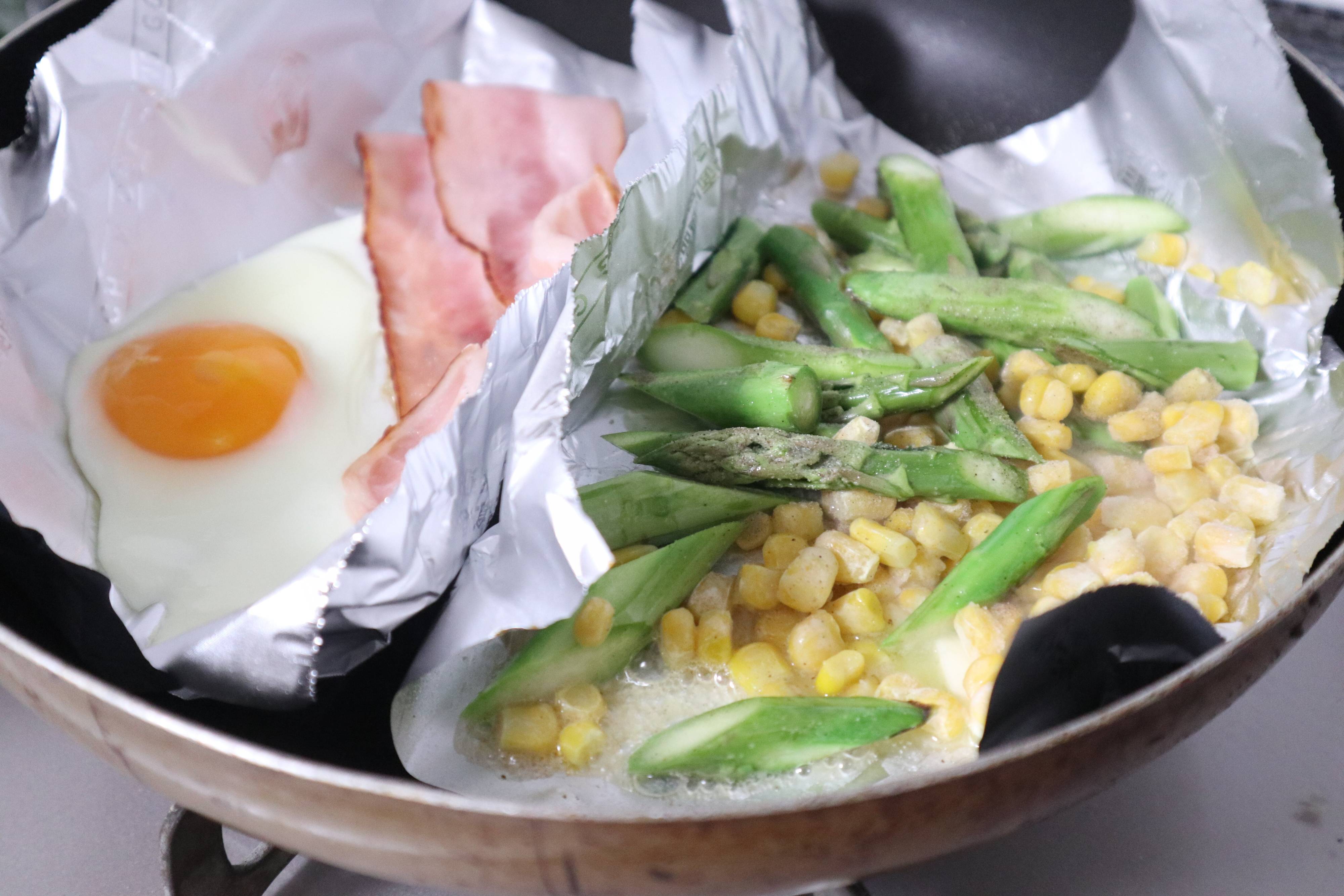 朝食はもちろんお弁当のおかずづくりにも同時調理を活用すると時短になります。フライパン用アルミホイルはいそがしい朝の救世主です。