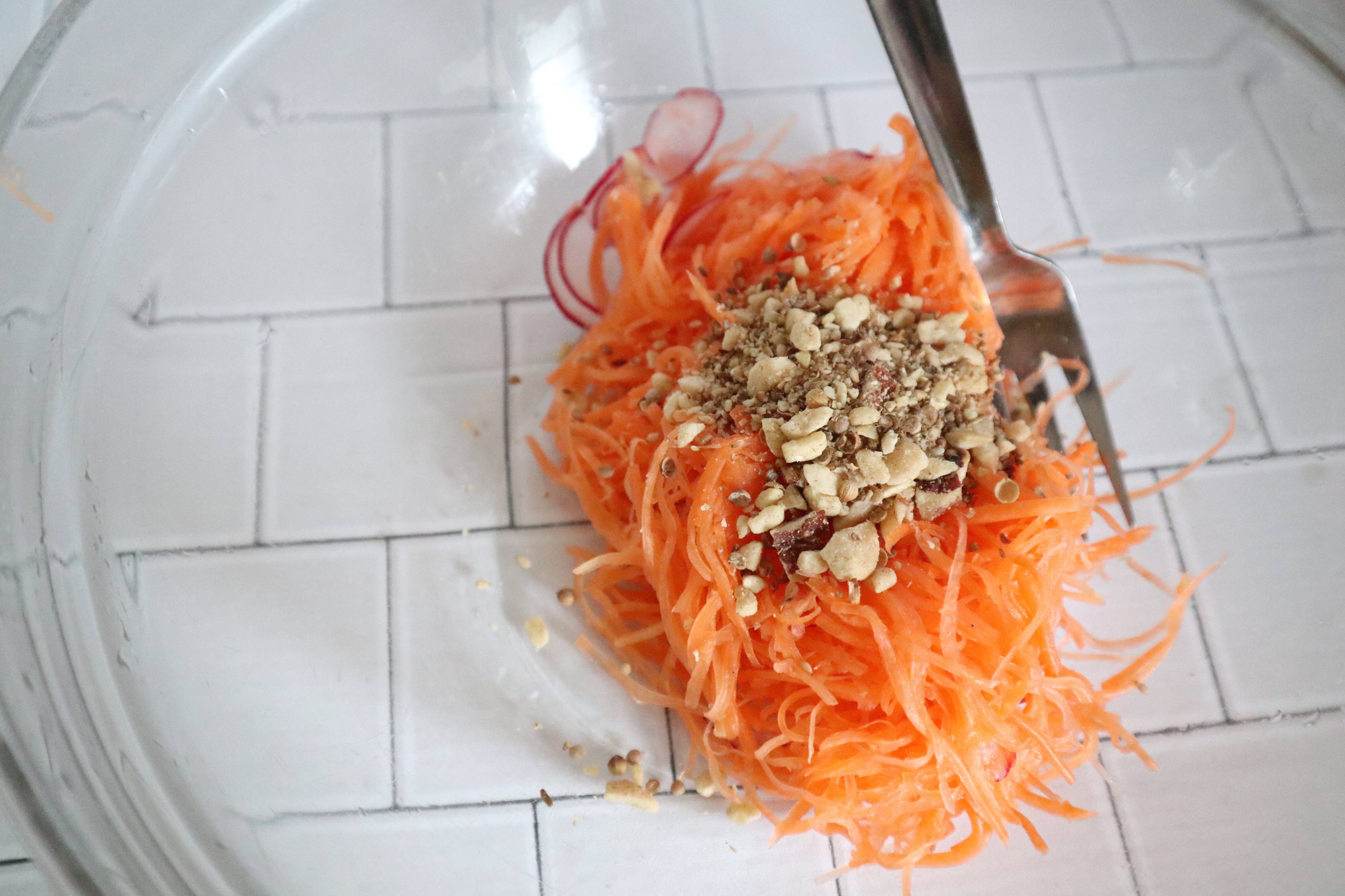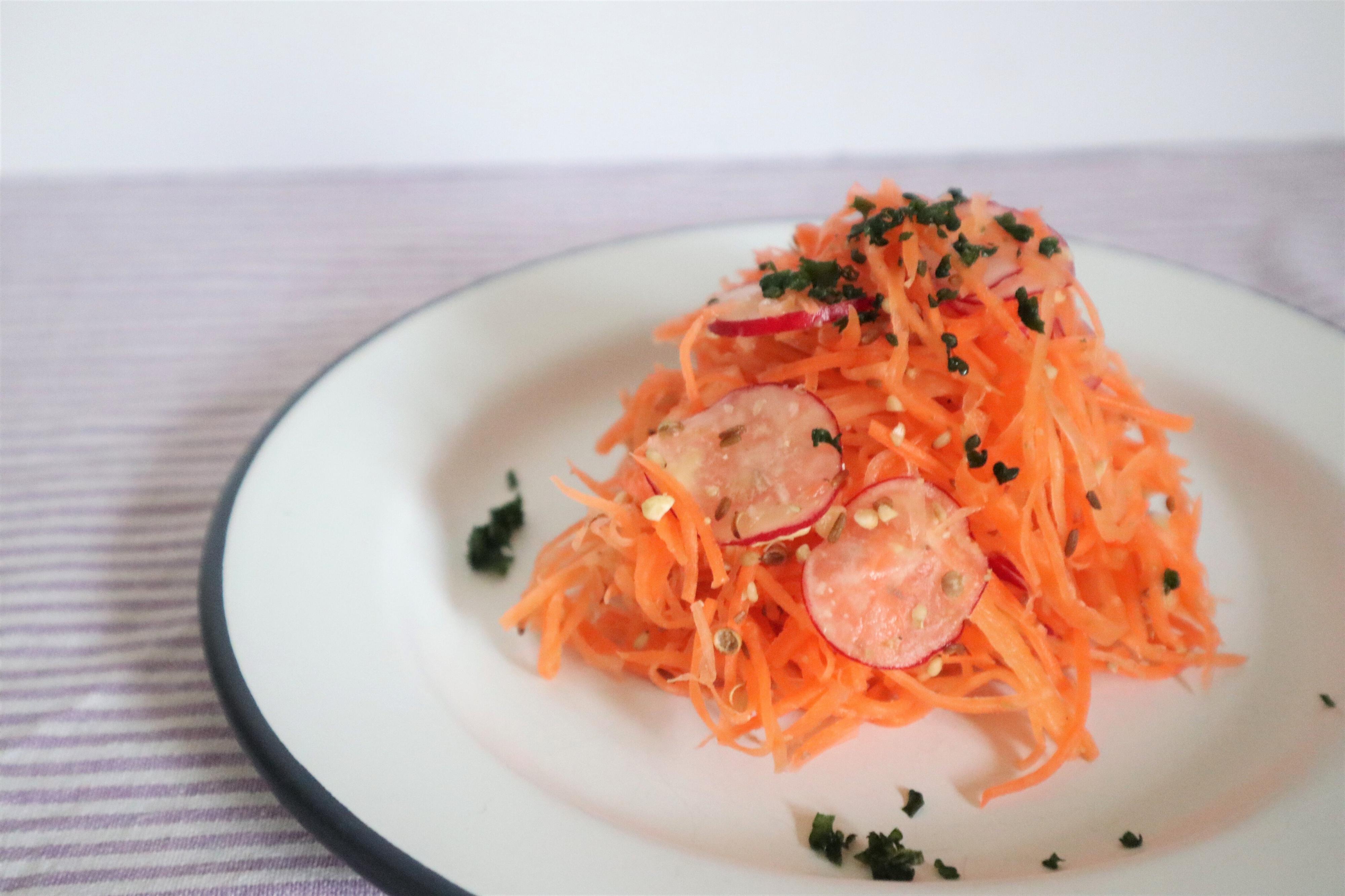 1.人参は千切り、ラディッシュは薄切りにして、ボウルに合わせて塩適量を振って塩もみする。水けをしっかり切る。