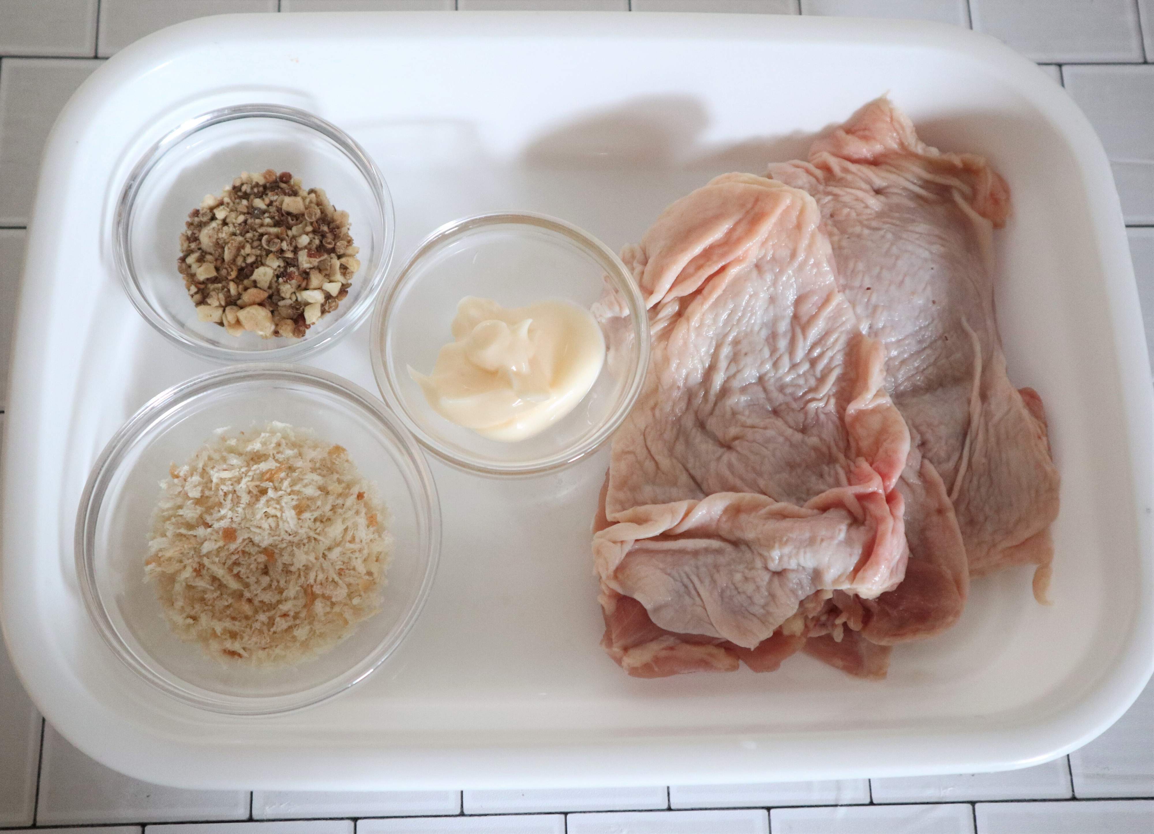 1.鶏モモ肉は、半分に切り皮面にフォークで数か所穴をあける。マヨネーズを両面にぬる。