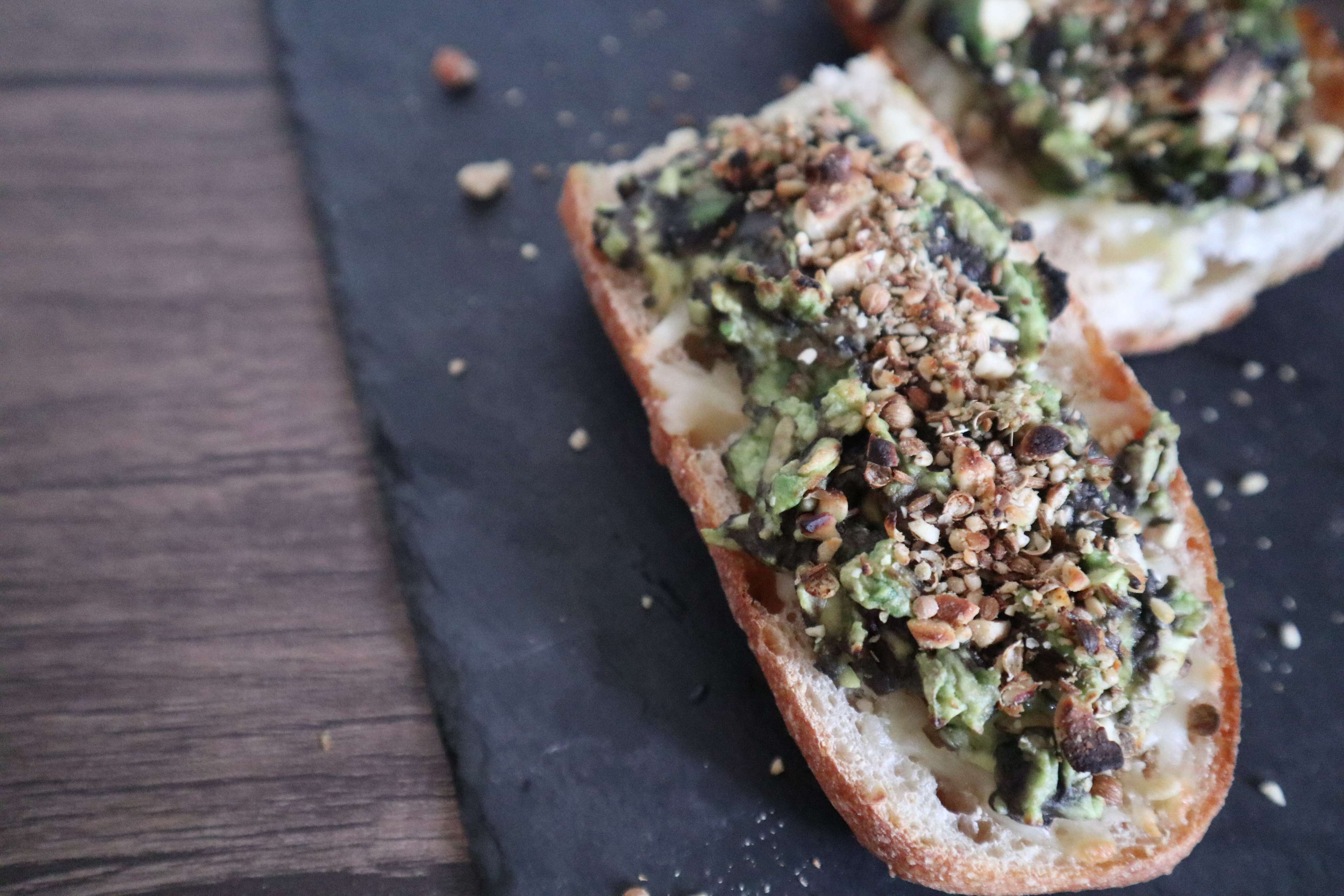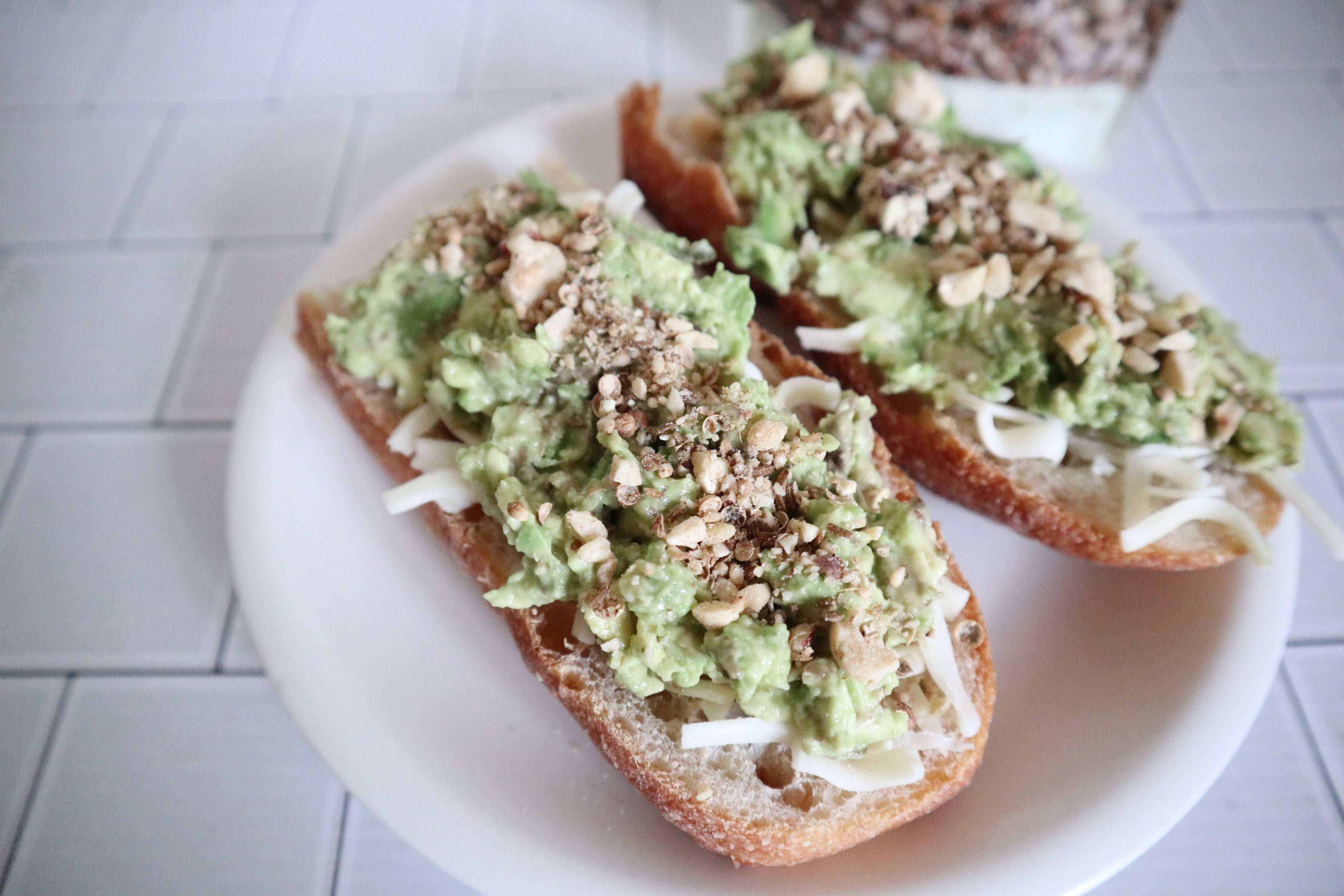 2.バゲットにチーズ、アボカド、デュカをのせてトーストする。