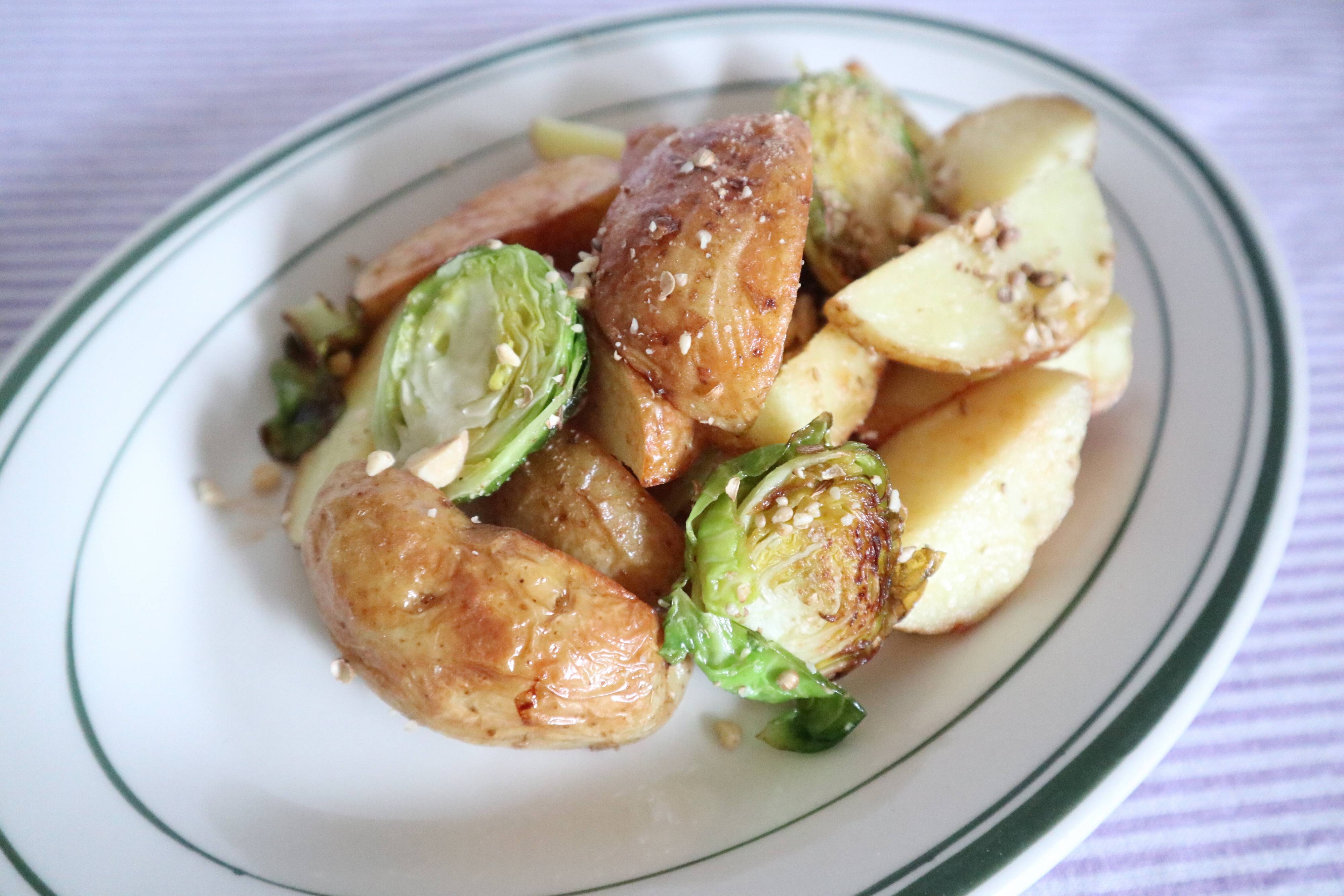 素揚げした旬の野菜(写真は新じゃがと芽キャベツ)にデュカをひと振りすれば、副菜が即完成。