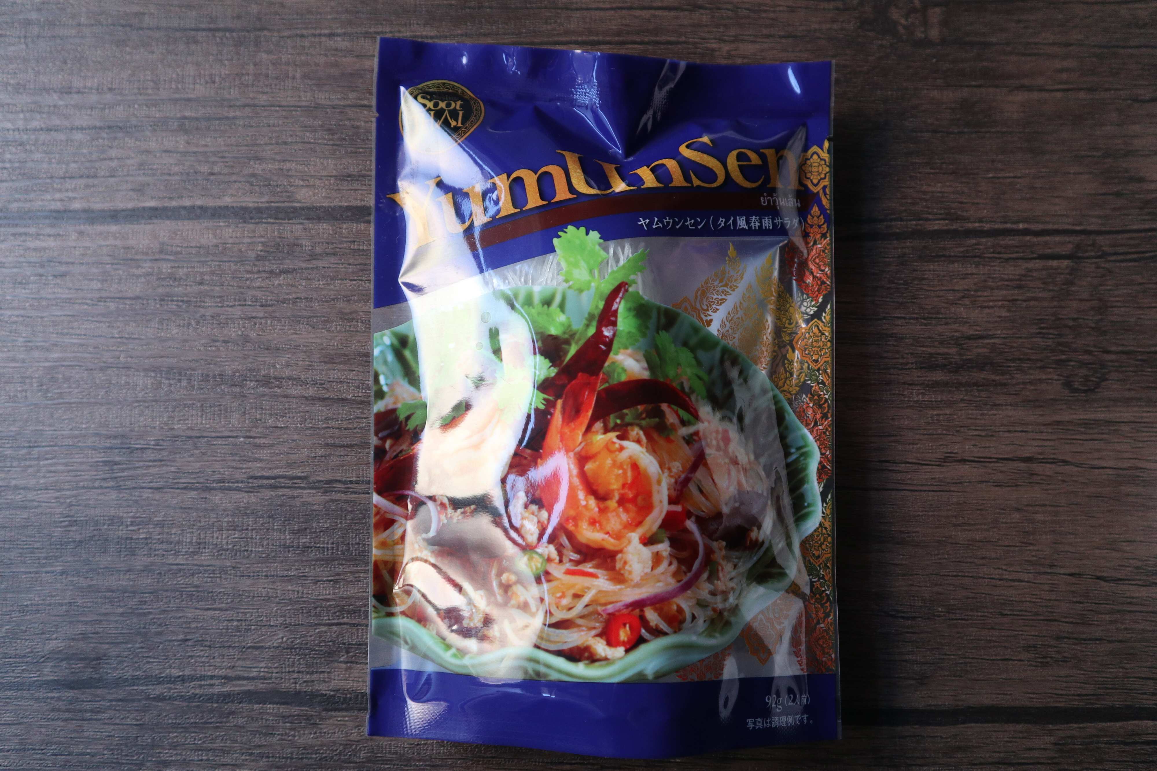 ヤムウンセンセットの中身は、春雨40g、ヤムソース50g、かやく(紫玉ねぎ、唐辛子)2gです。