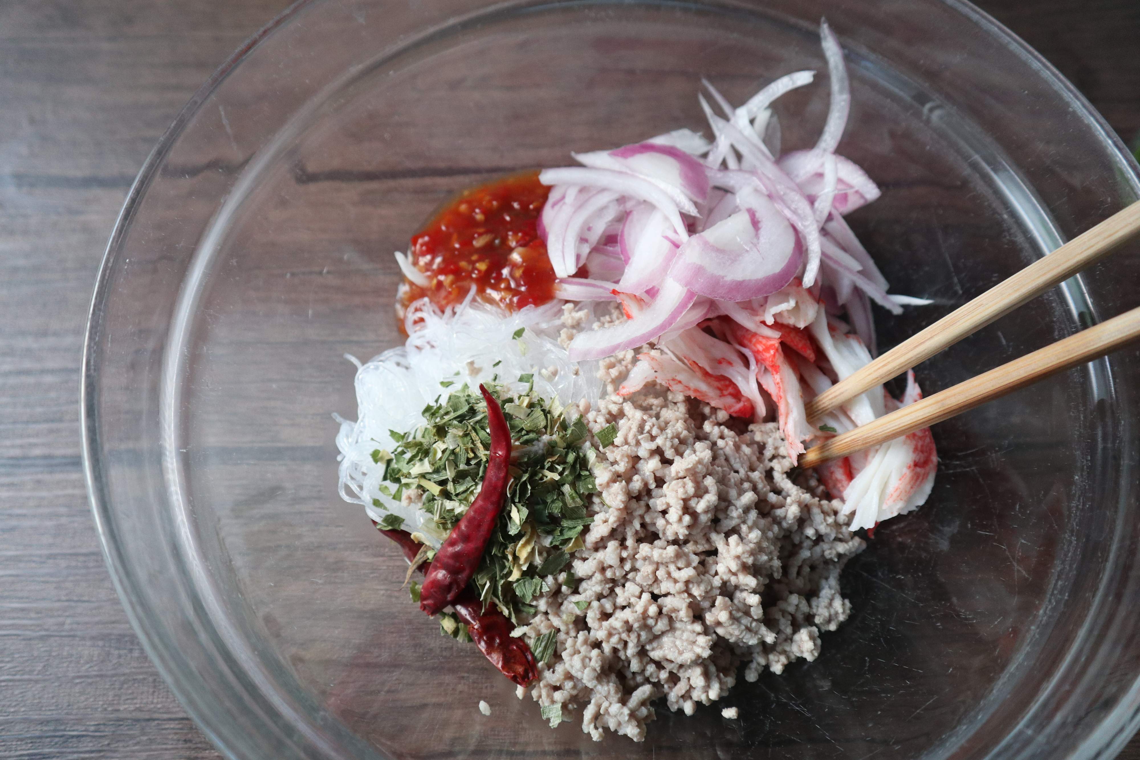 酸味とピリッとした辛さ、ライムの爽やかさでさっぱりしつつも、ナンプラーの深みのあるコクを感じるヤムウンセンの完成です。
