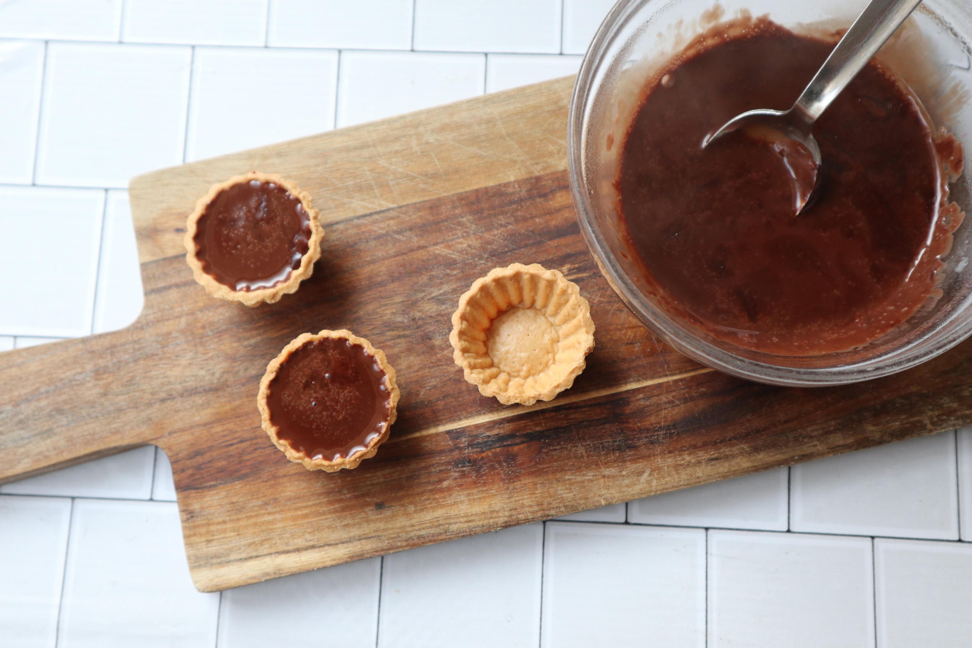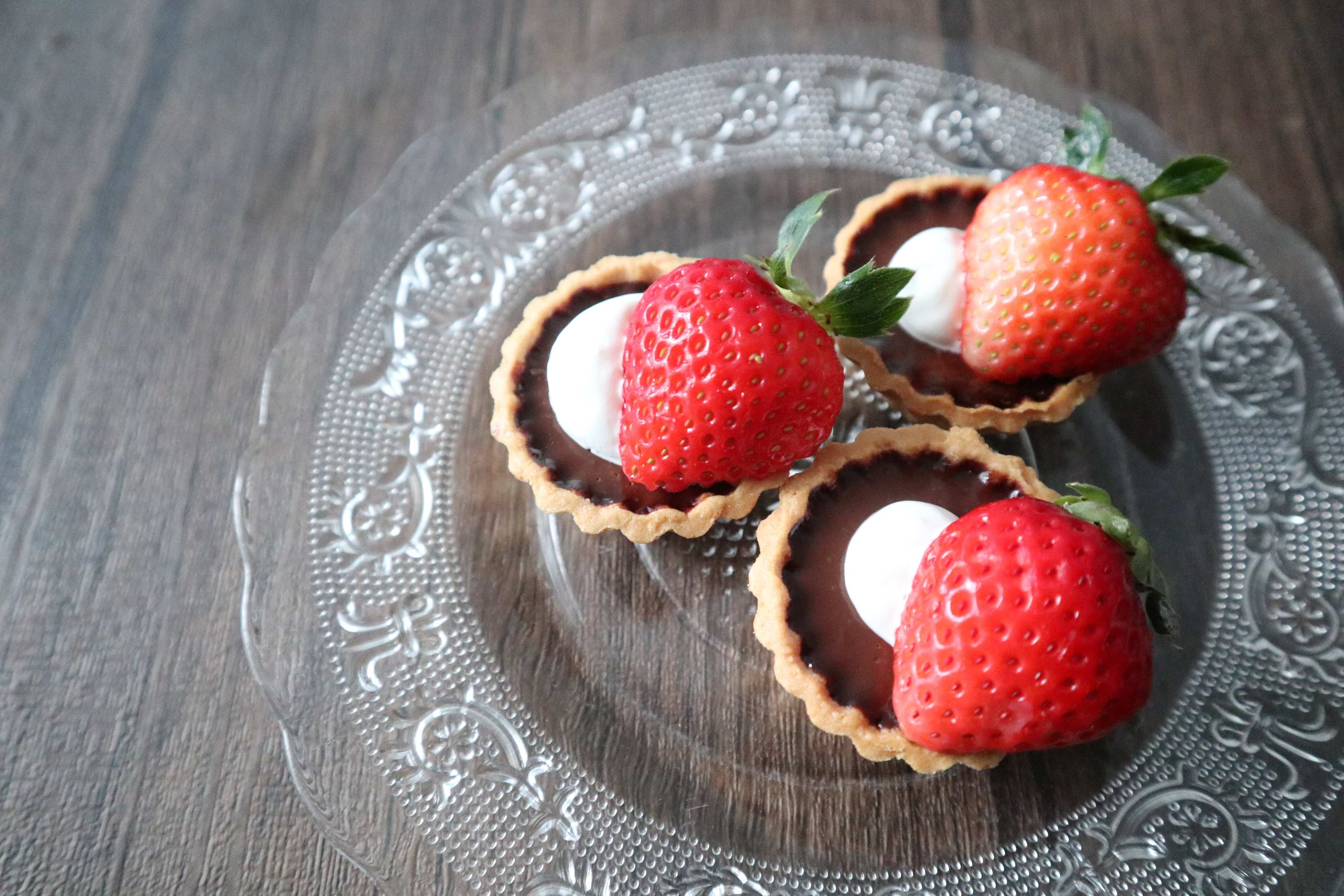 市販のタルト台に(使っているのはダイソー)、溶かしたチョコババロアを流しいれて冷蔵庫で冷やして固めて、ホイップクリームと苺をトッピングしたら完成です。