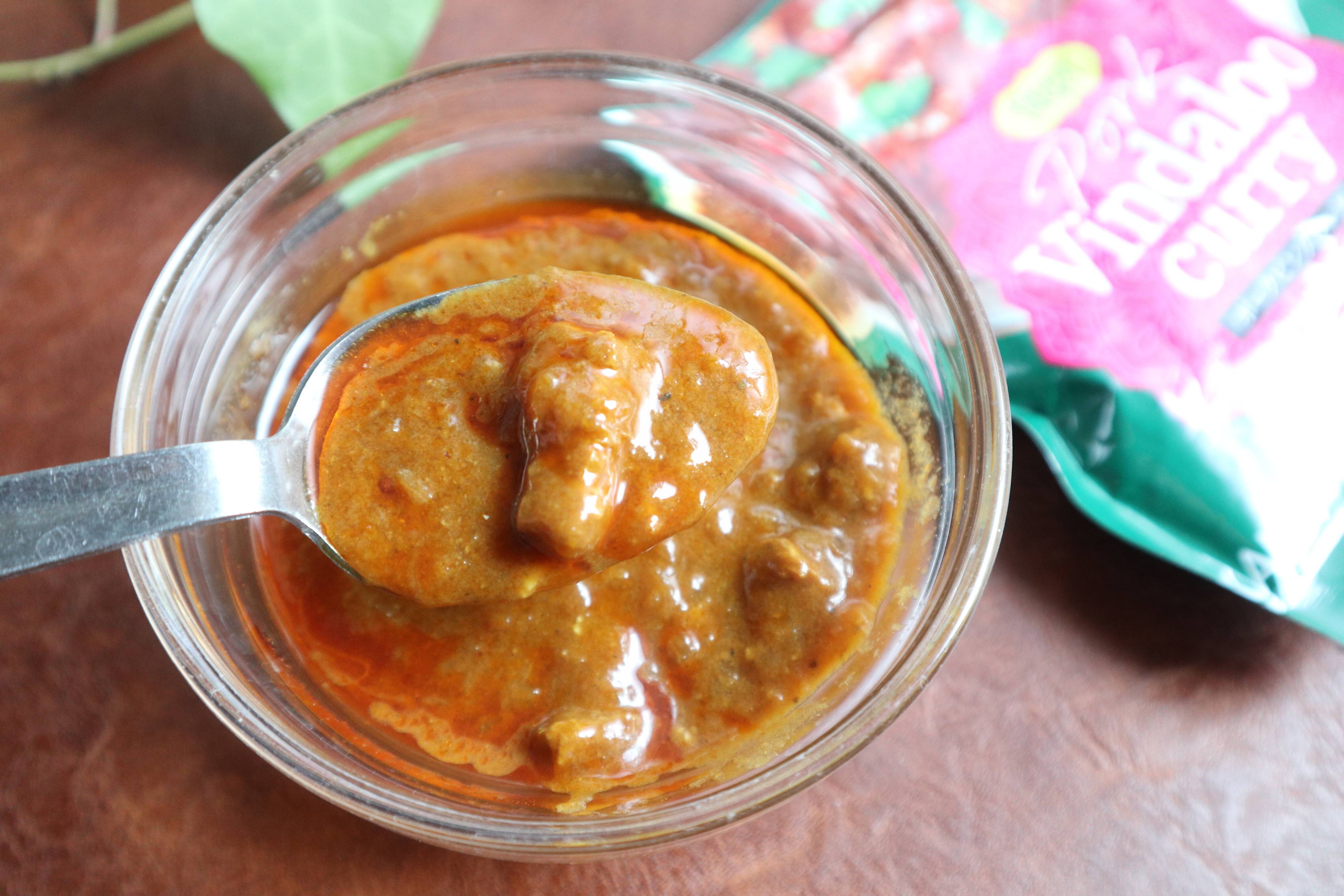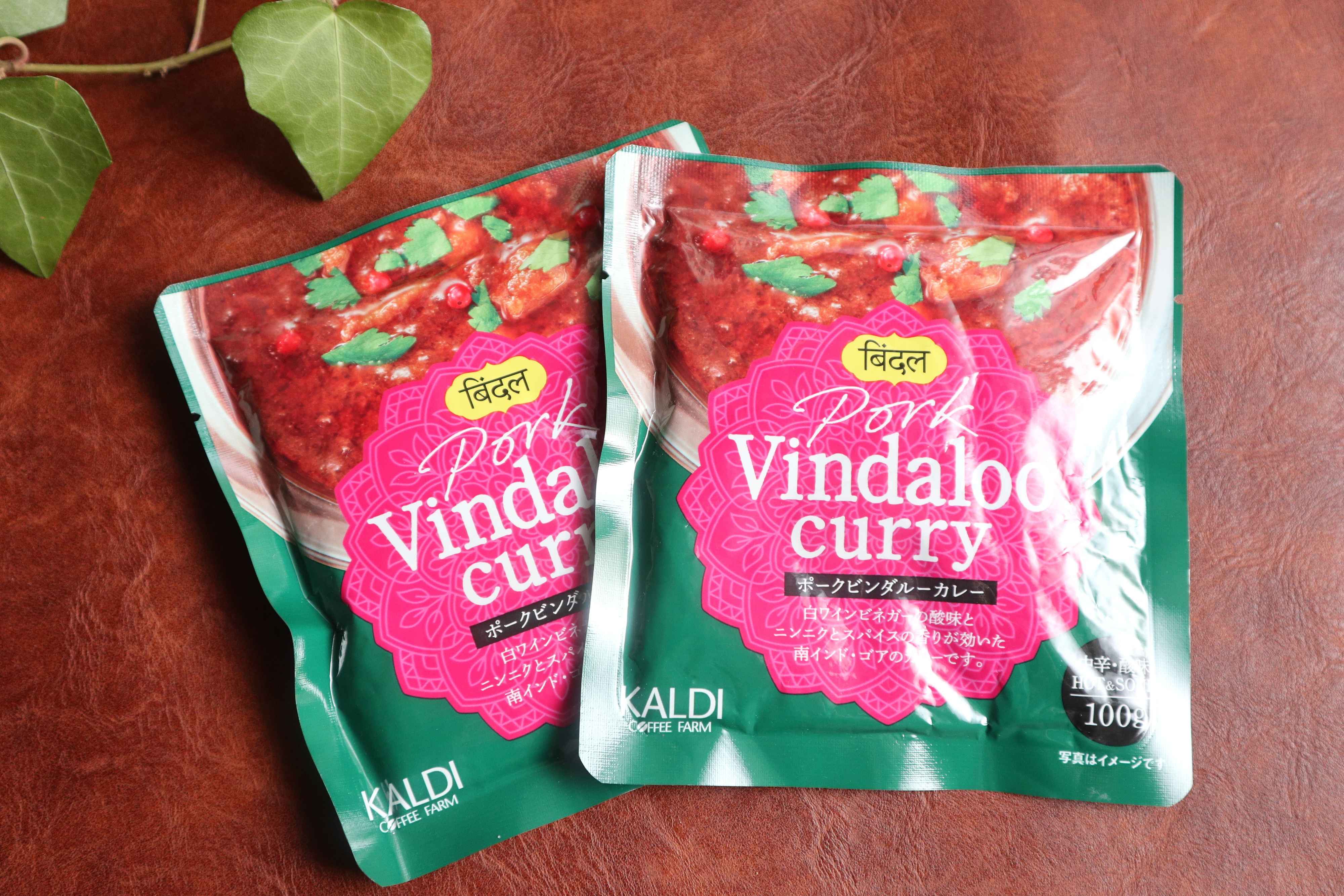カルディの「ポークビンダルーカレー」。1人前100g入りで226円(税込)です。酸味が特徴の本格的な南インド・ゴアのカレーが、家庭で200円台で食べられるのはうれしいですよね。