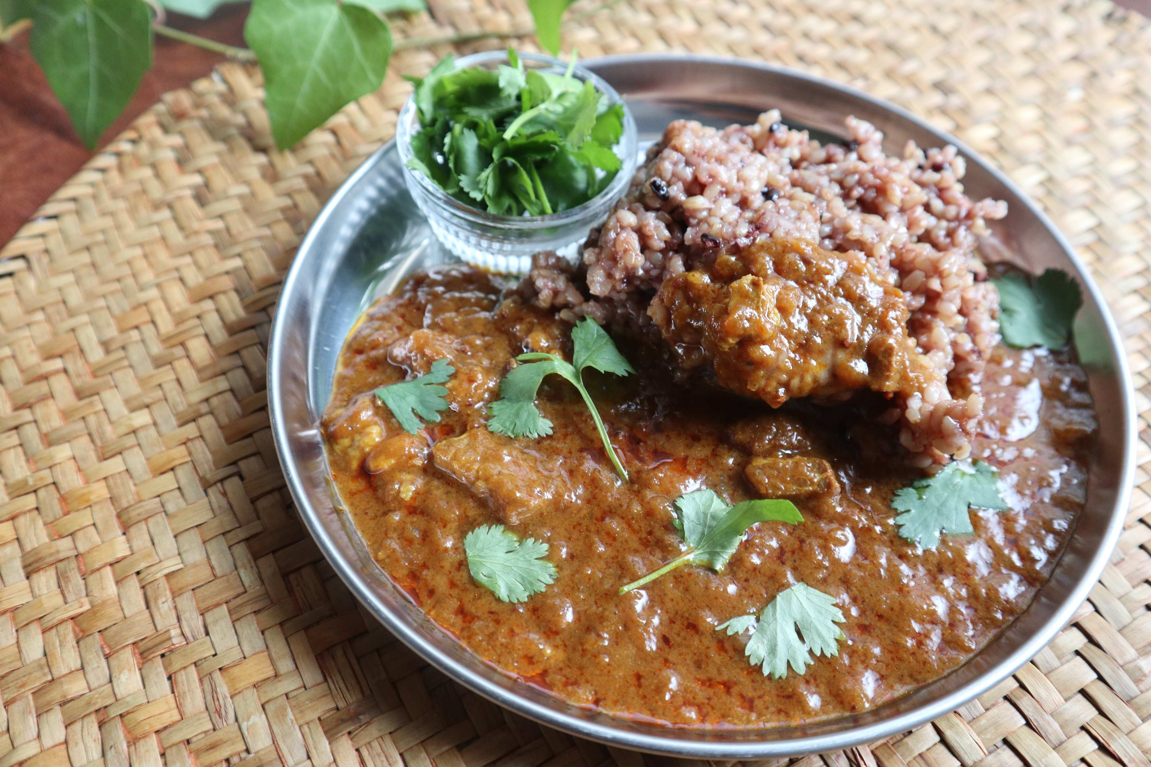ごはん(今回は寝かせ玄米を利用)に温めたビンダルーカレーをかけて、パクチーを添えてみました。