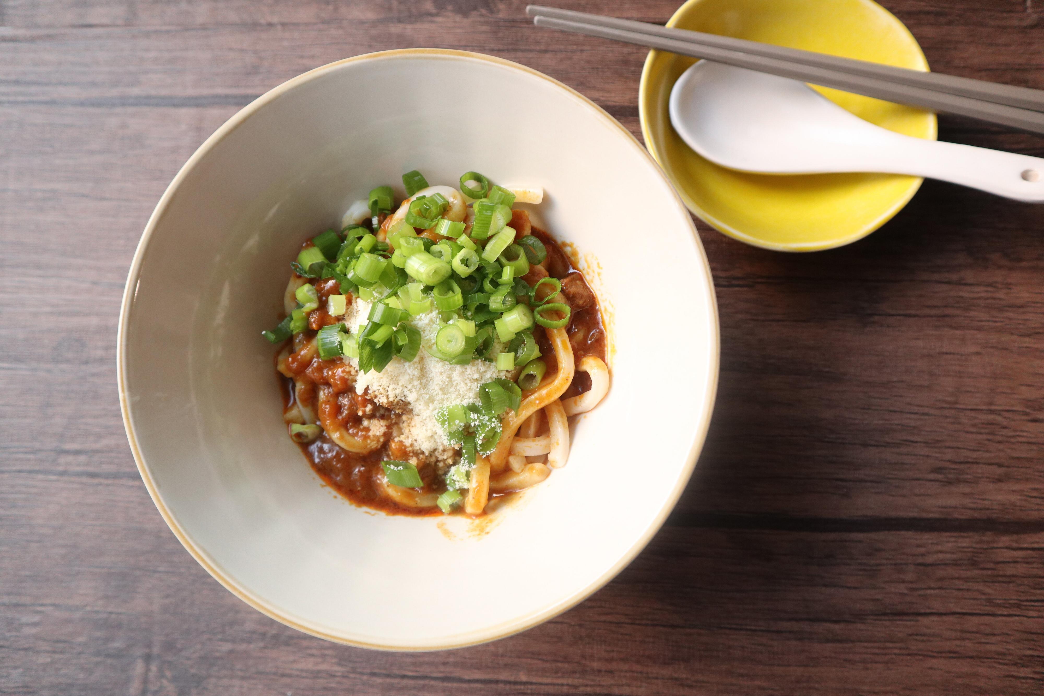 さらに粉チーズを加えることでまろやかさとコクが加わり、小葱でシャキシャキの食感も楽しめます。うどんにビンダルカレーがしっかりからんで美味!