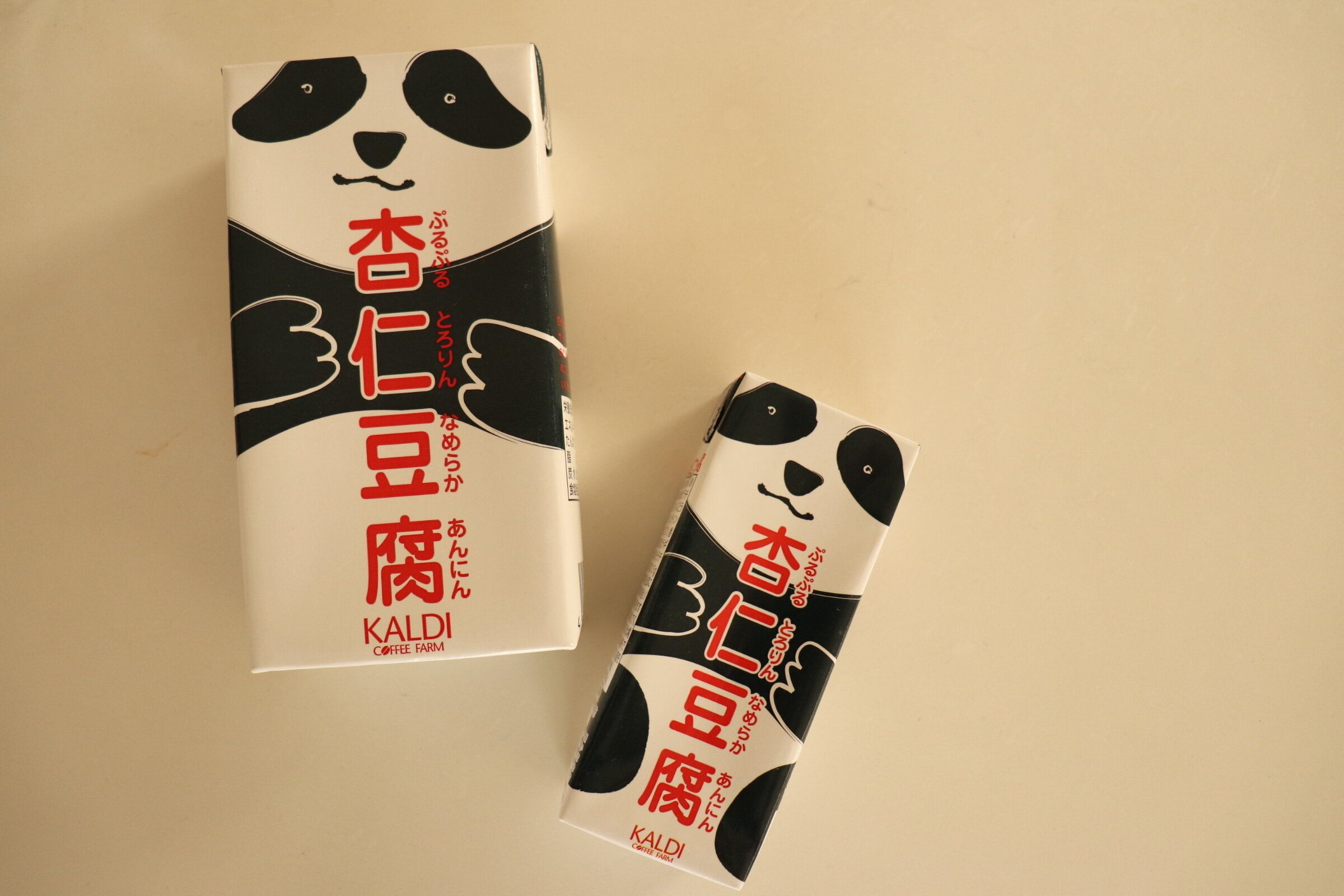 カルディの杏仁豆腐は大きさが2種類あります。大きいサイズの500ml(写真左)のものとミニサイズ(写真右)の200mlのもの。