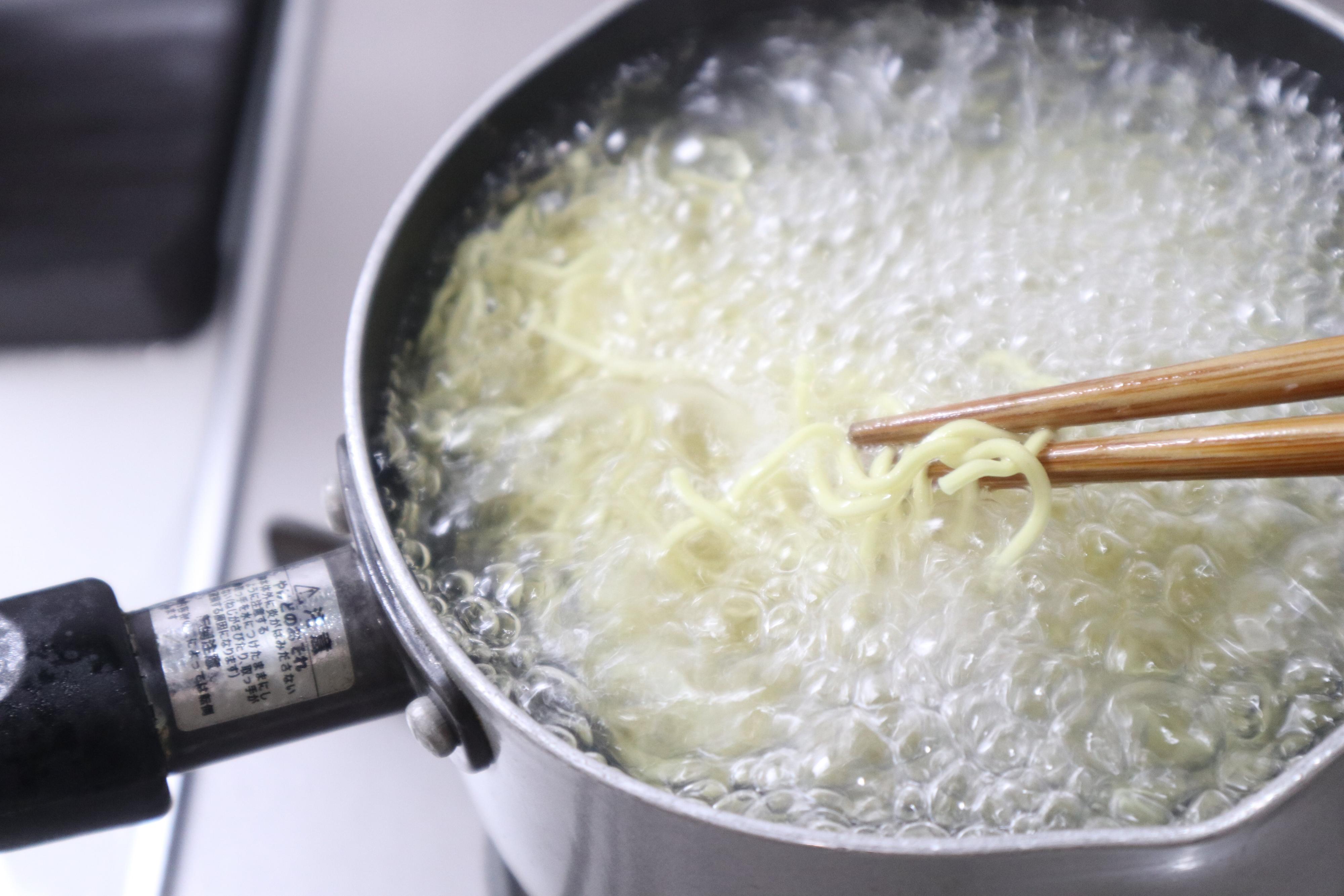 鍋にお湯を沸騰させて、麺を入れて4分半茹でます。