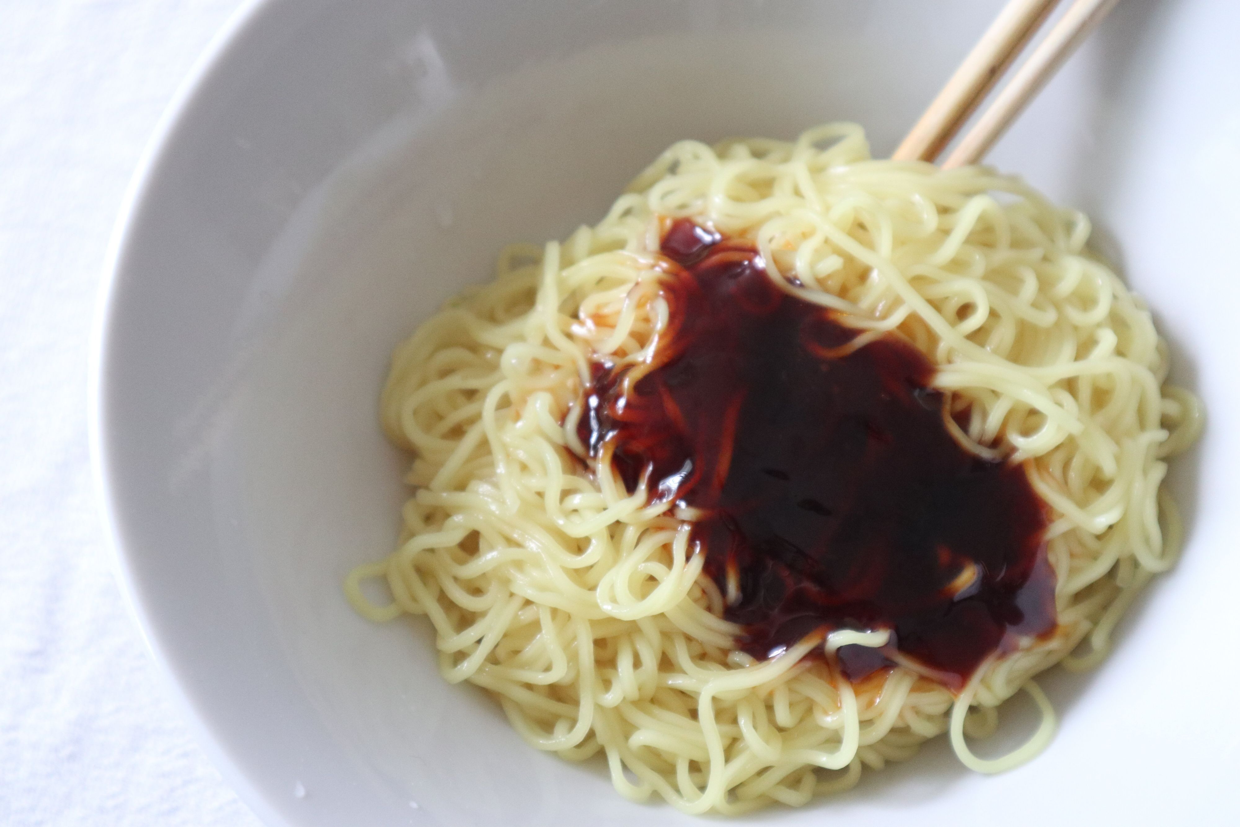 茹で上がった麺をざるにあけ、冷水で水洗いして、その後しっかり水けを切ったら、器に入れタレを加えます。