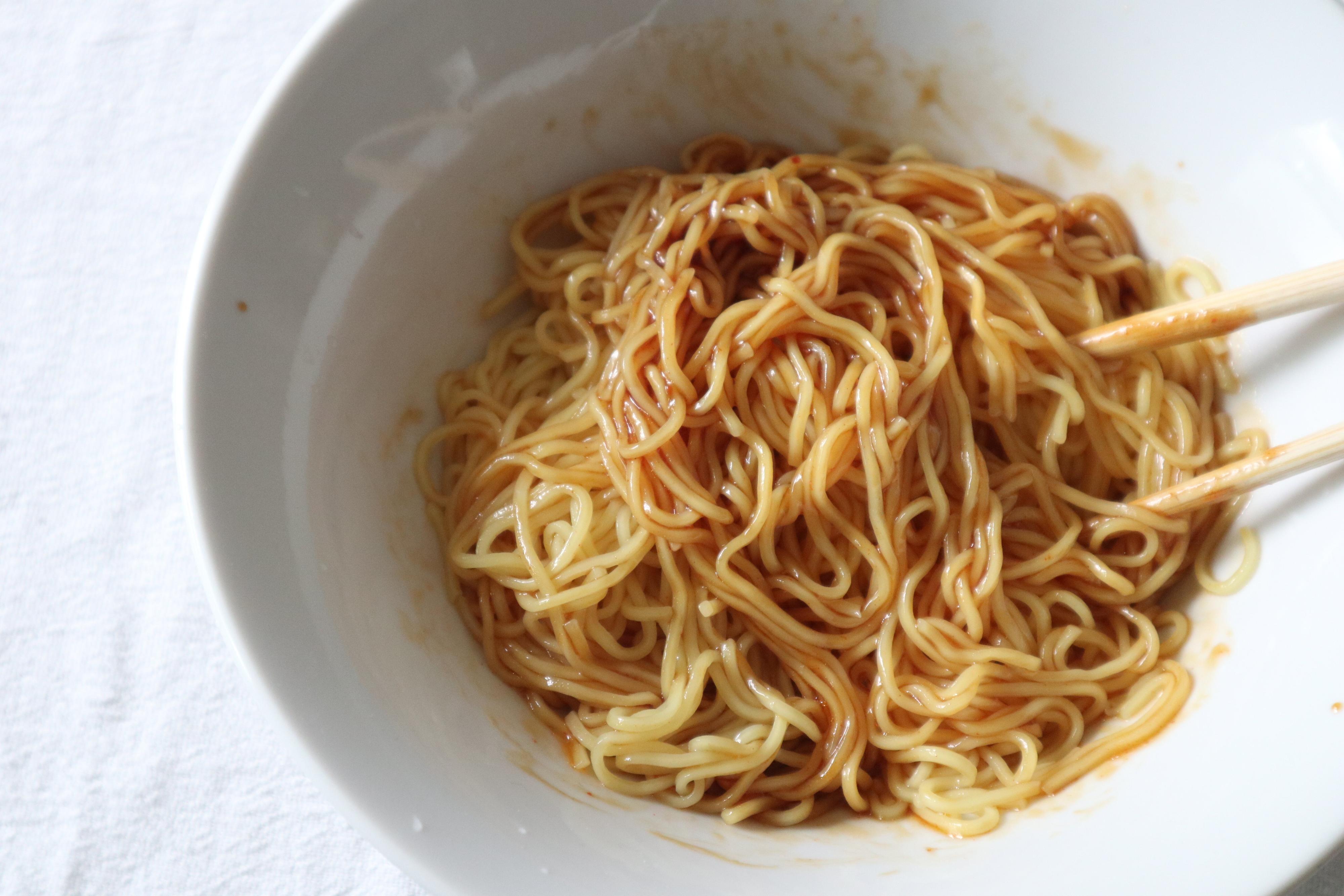 しっかりまんべんなくタレが絡まるように混ぜます。旨みたっぷりのたれなのでシンプルにこの状態に生卵を落としてネギをかけて釜たまそばにしてもおいしいです。超手軽に即食べることができます。