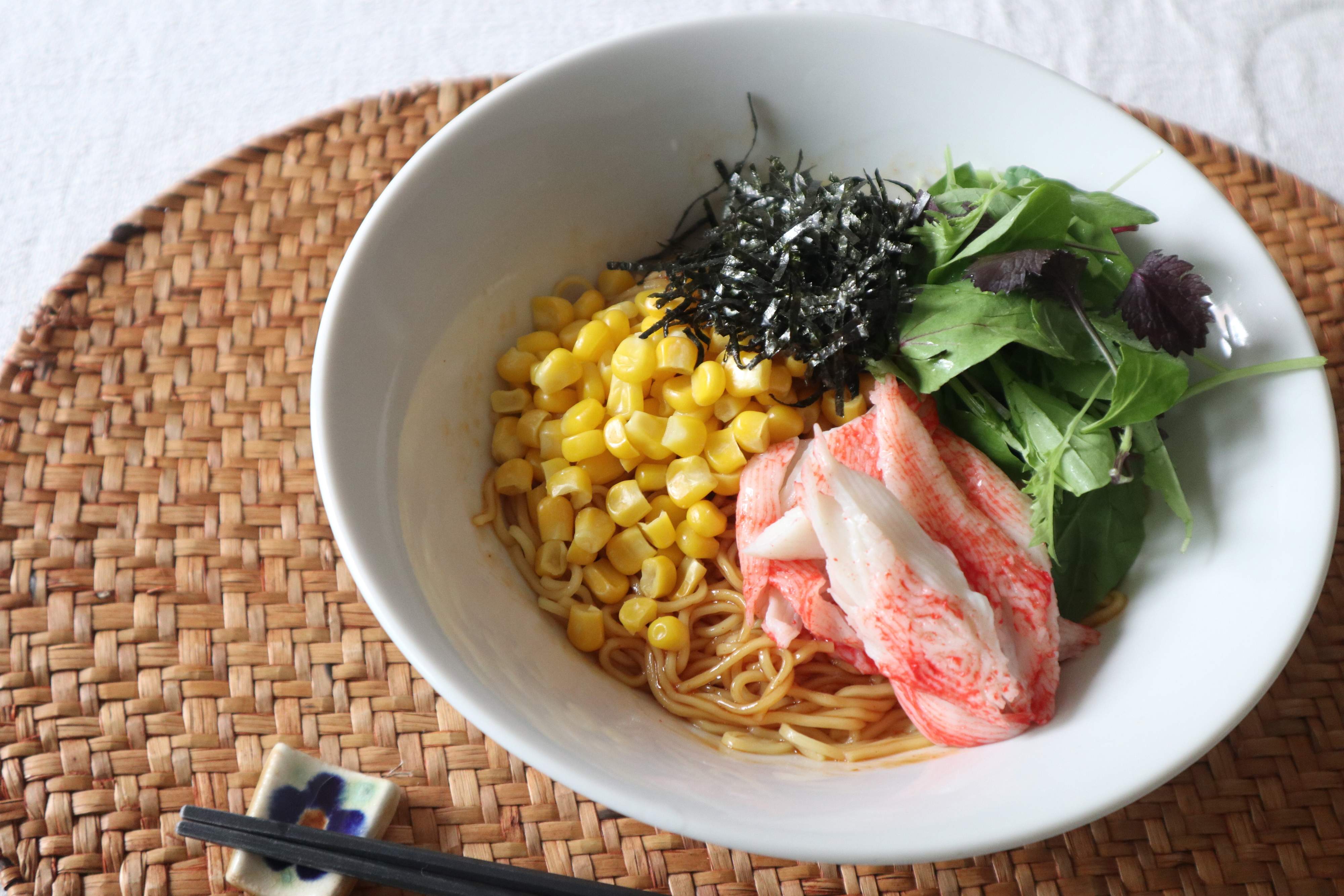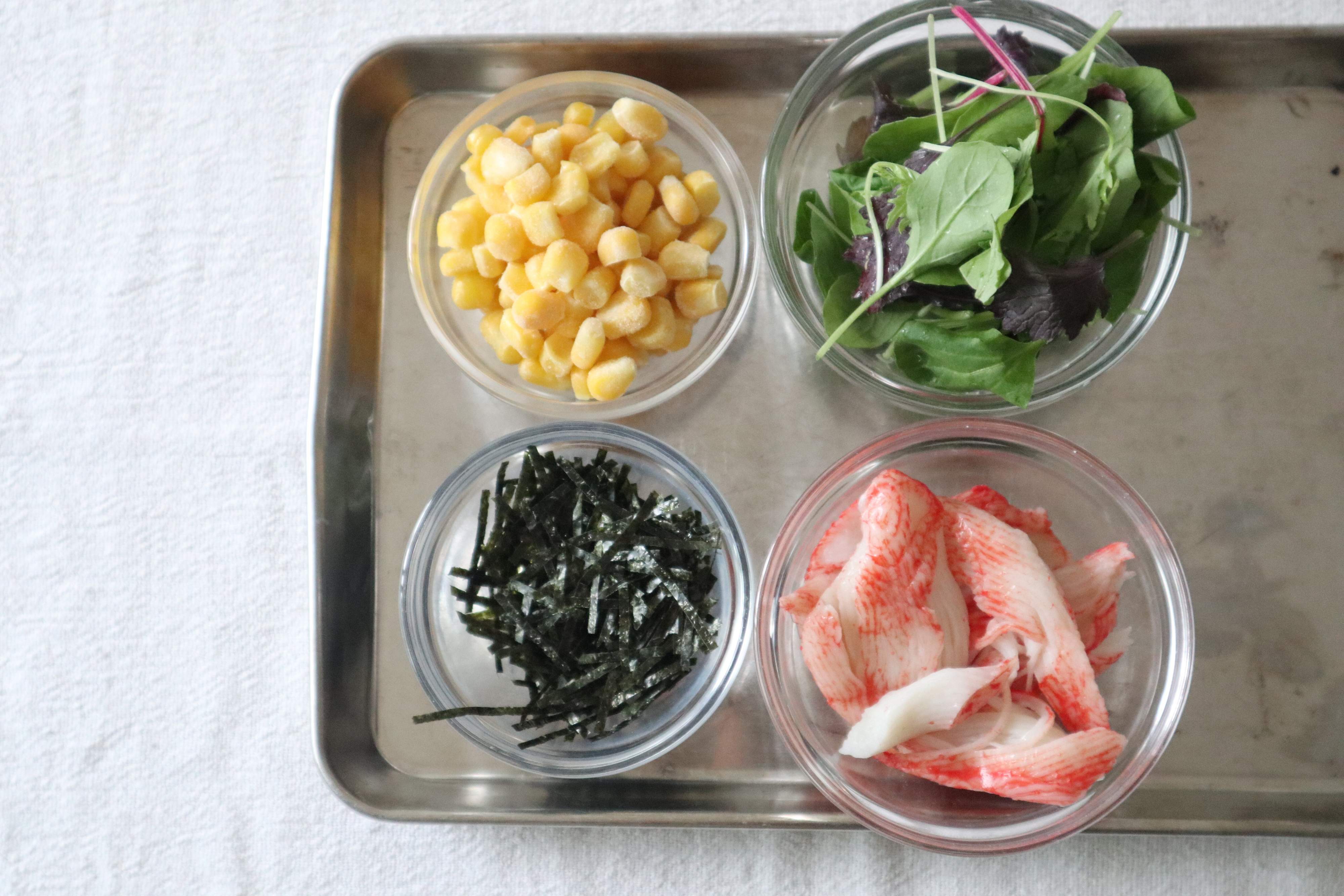 トッピングする具材は、かにかま、コーン、刻みのり、ベビーリーフを用意しました。