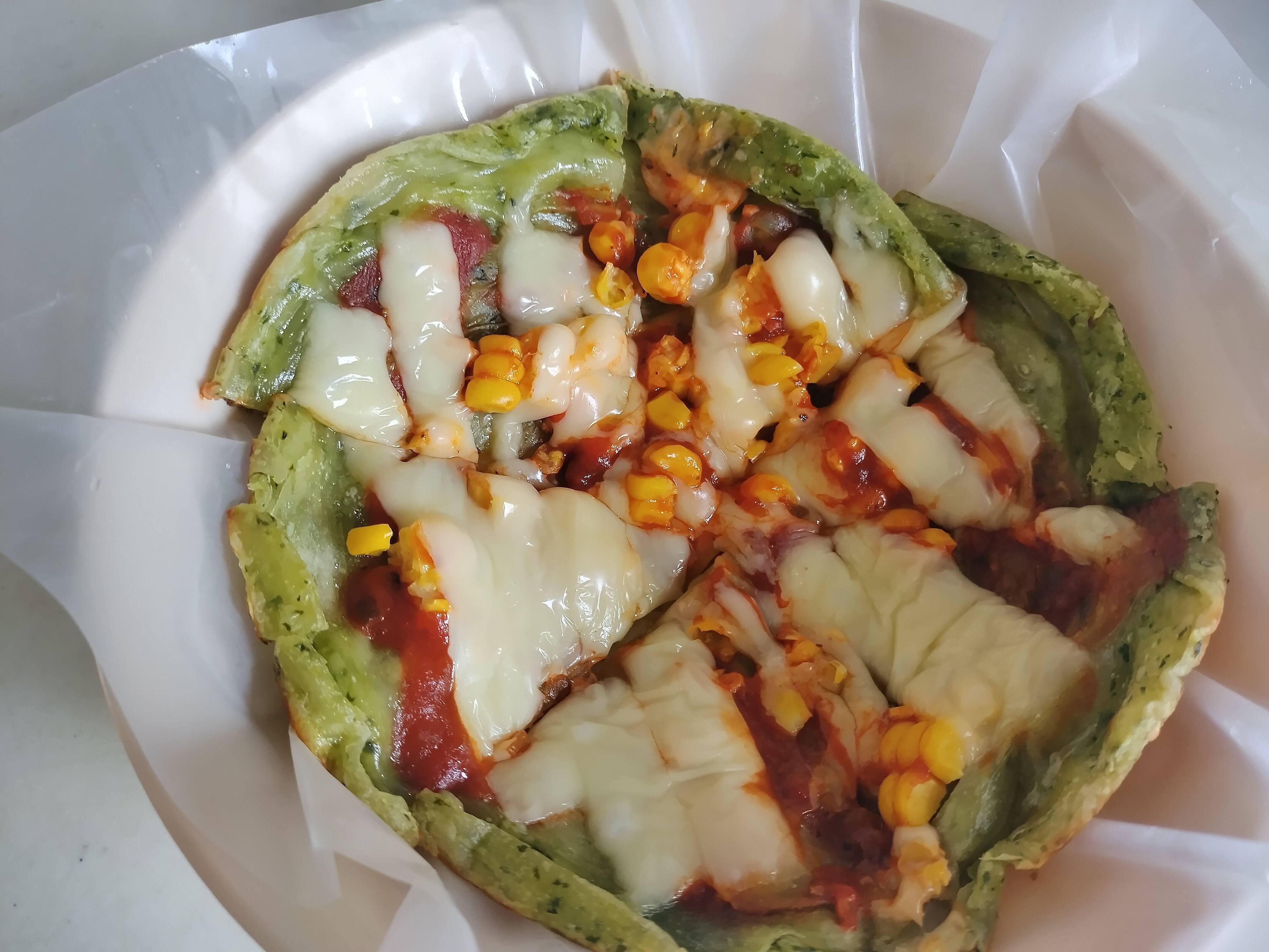 フライパンで「バジル入り」の片面を焼いたら、ピザソースとチーズ、コーンをのせてフタをします。チーズが溶けたら完成!生地にバジルが入っているので、マルゲリータのような味わいのピザになります。