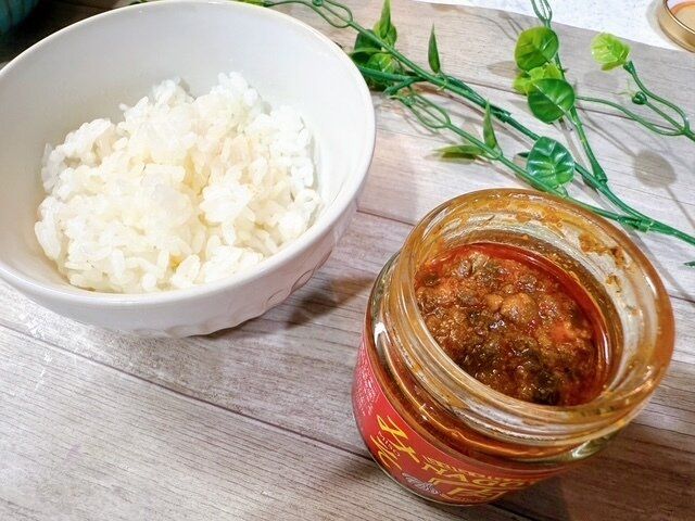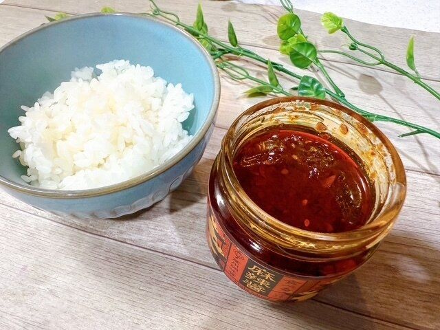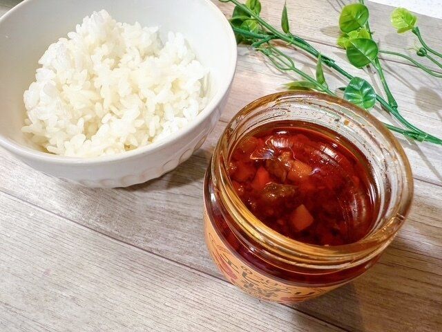 油ベースで具材玉ねぎ生姜・松の実・干しエビなどがザクザク入っていて、単なるラー油ではなく食べる調味料という名がぴったりというほど具だくさん。