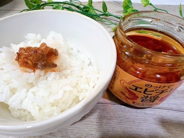 刻んだエビとレンコンの食感が楽しめる、辛口のエビチリ味の醤、白ご飯・中華麺・パンなど“のせるだけ”で使えるタイプ。と記載があるのでご飯にのせて食べてみます。