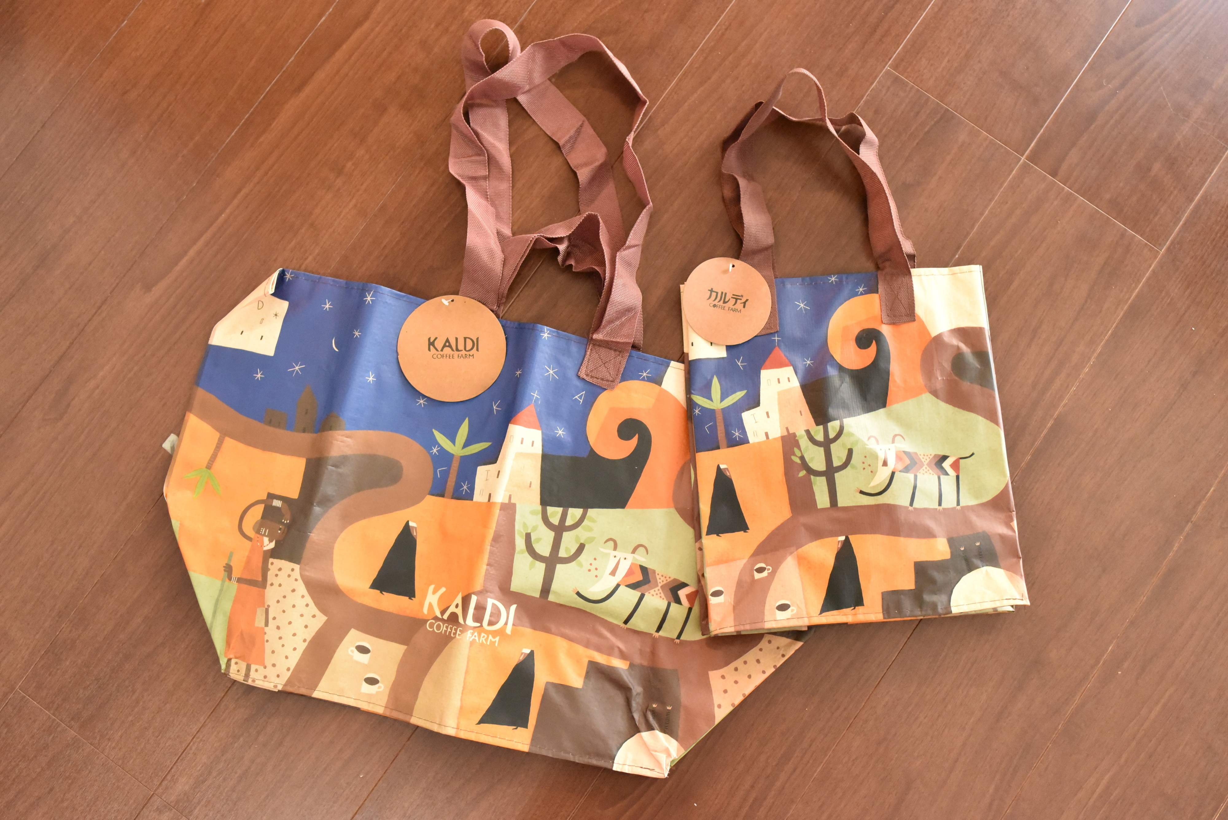 カルディのレジ周辺で販売されていることが多い、カルディの紙袋と同じ柄のエコバッグ。サイズは大小2つあり、大きいサイズは165円(税込)、小さいサイズは154円(税込)です。