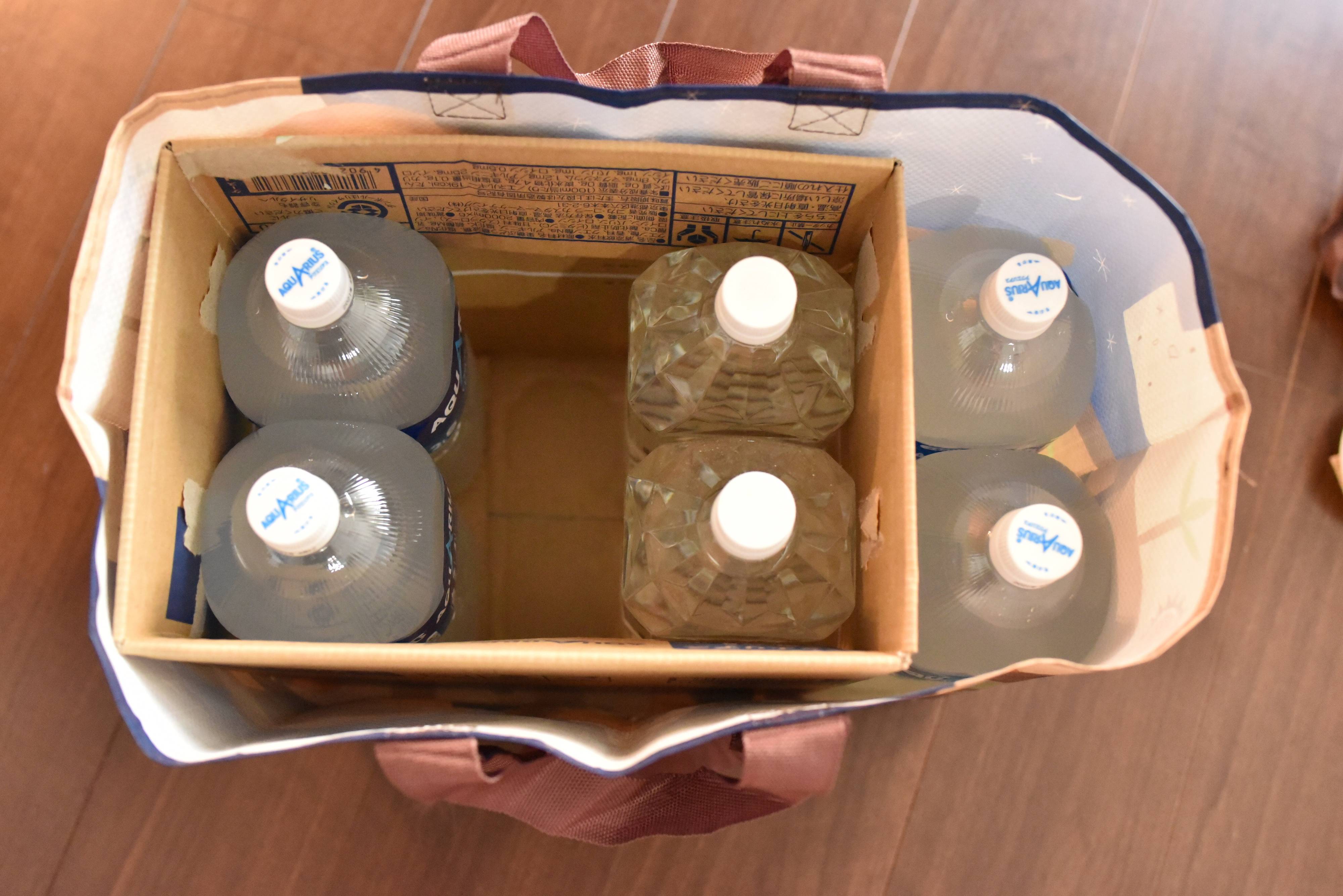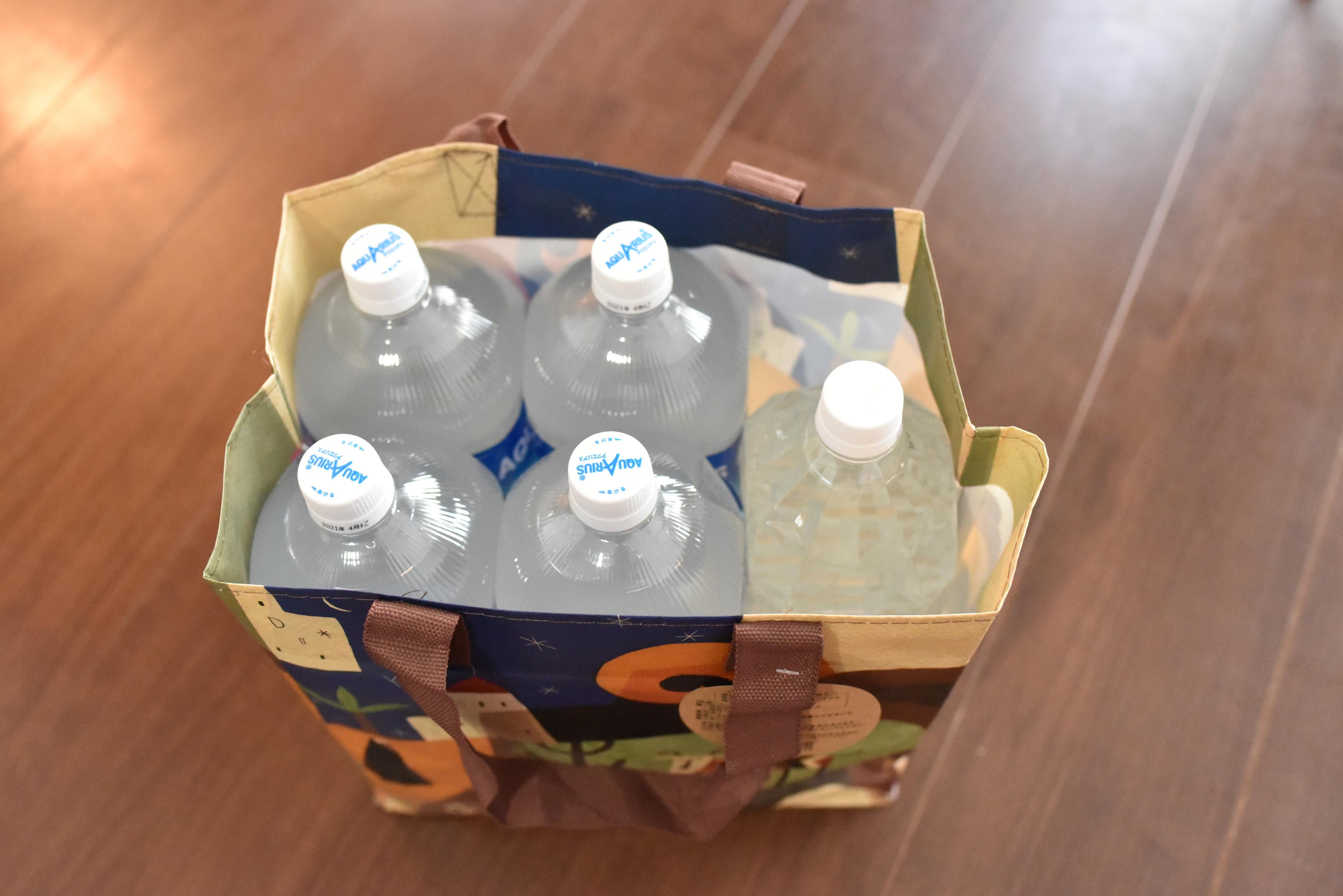 2リットルペットボトル6本が入っている箱を入れても、ほかに2本、合わせて8本も入れることができます。2リットルのボトルが8本だと、単純計算でも16kgあるのに、袋の強度に不安を感じることなく持ち上げることができます。165円のエコバッグとは思えない頑丈さです。
