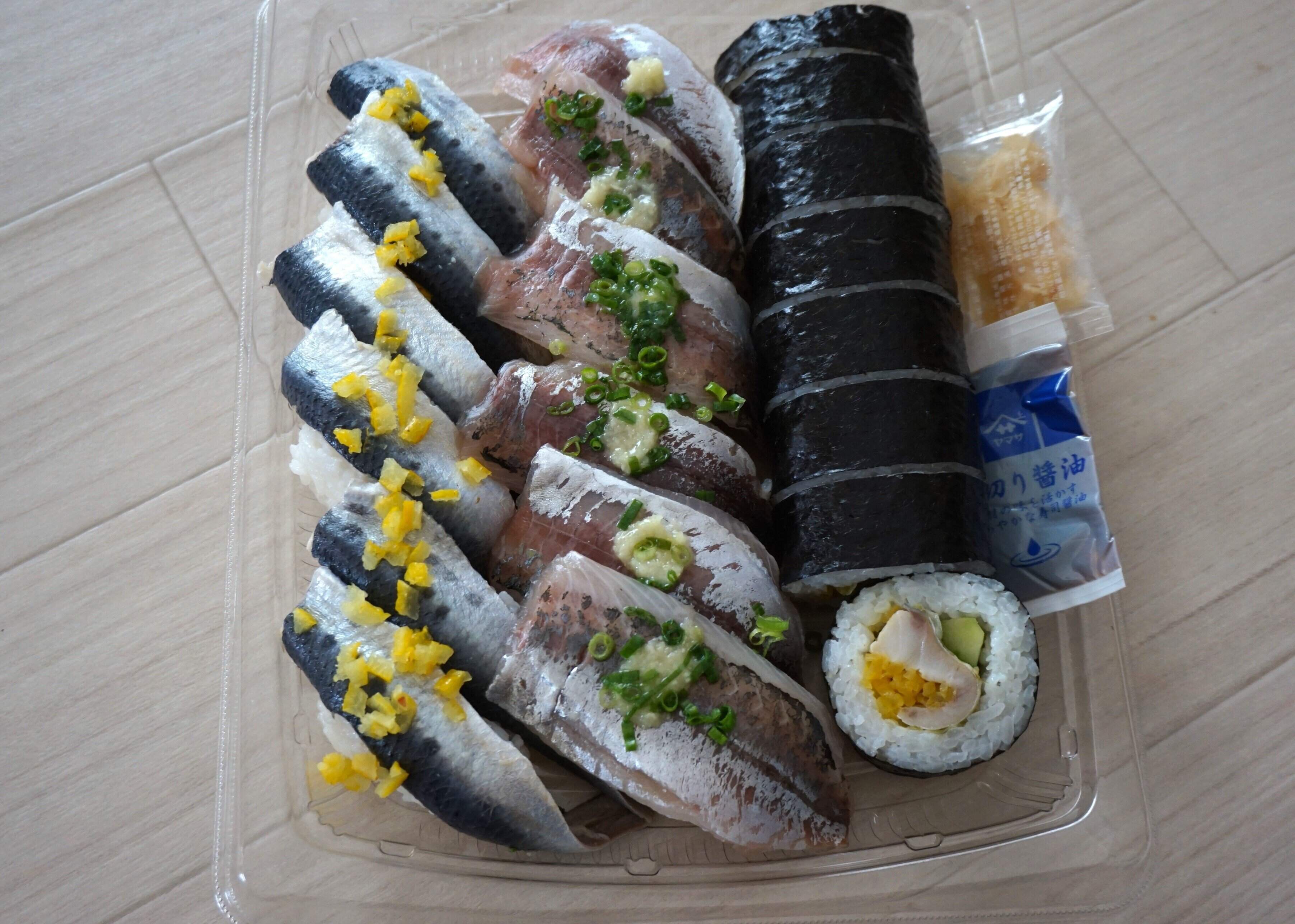 酢じめいわし握り(6貫)、まあじ握り(6貫)、昆布じめのさばののり巻き(8個)と3種類のお寿司がセットになっています。