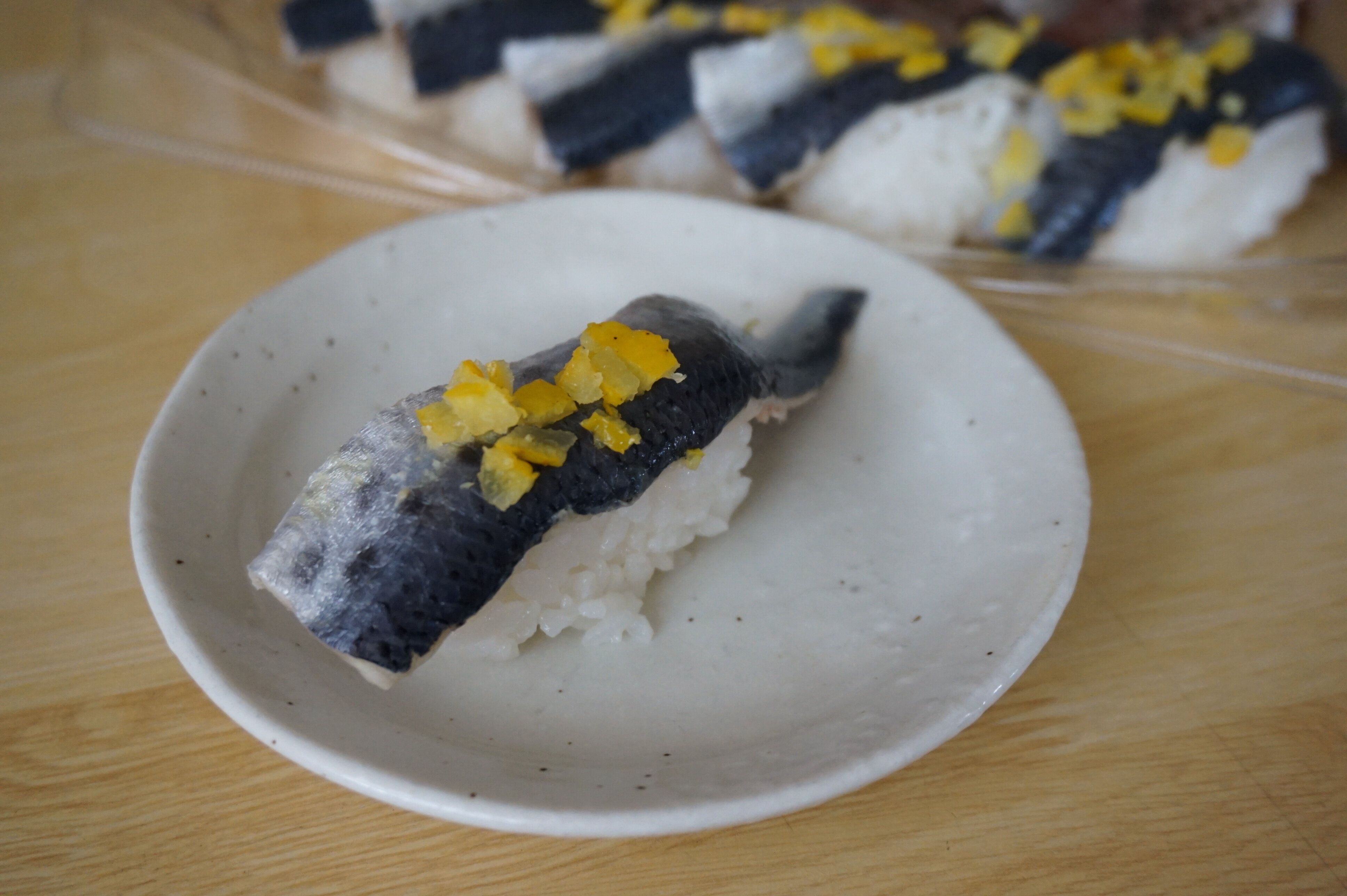 醤油とがりが入ってましたが、わさびはついていませんでした。こちらのお寿司はどれも薬味があらかじめ乗っていたり中に入っていたりするので、確かにわさびはいらないかなという印象です。