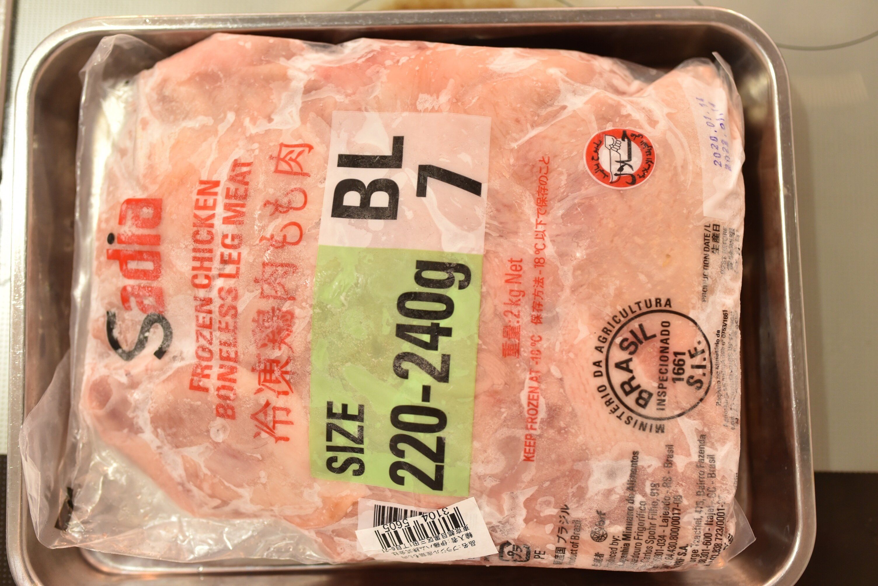 パッケージに記載されている220-240gという表記は、もも肉1枚あたりのサイズになります。全体で2kgなので、8~9枚のもも肉が入っているという表示になります。