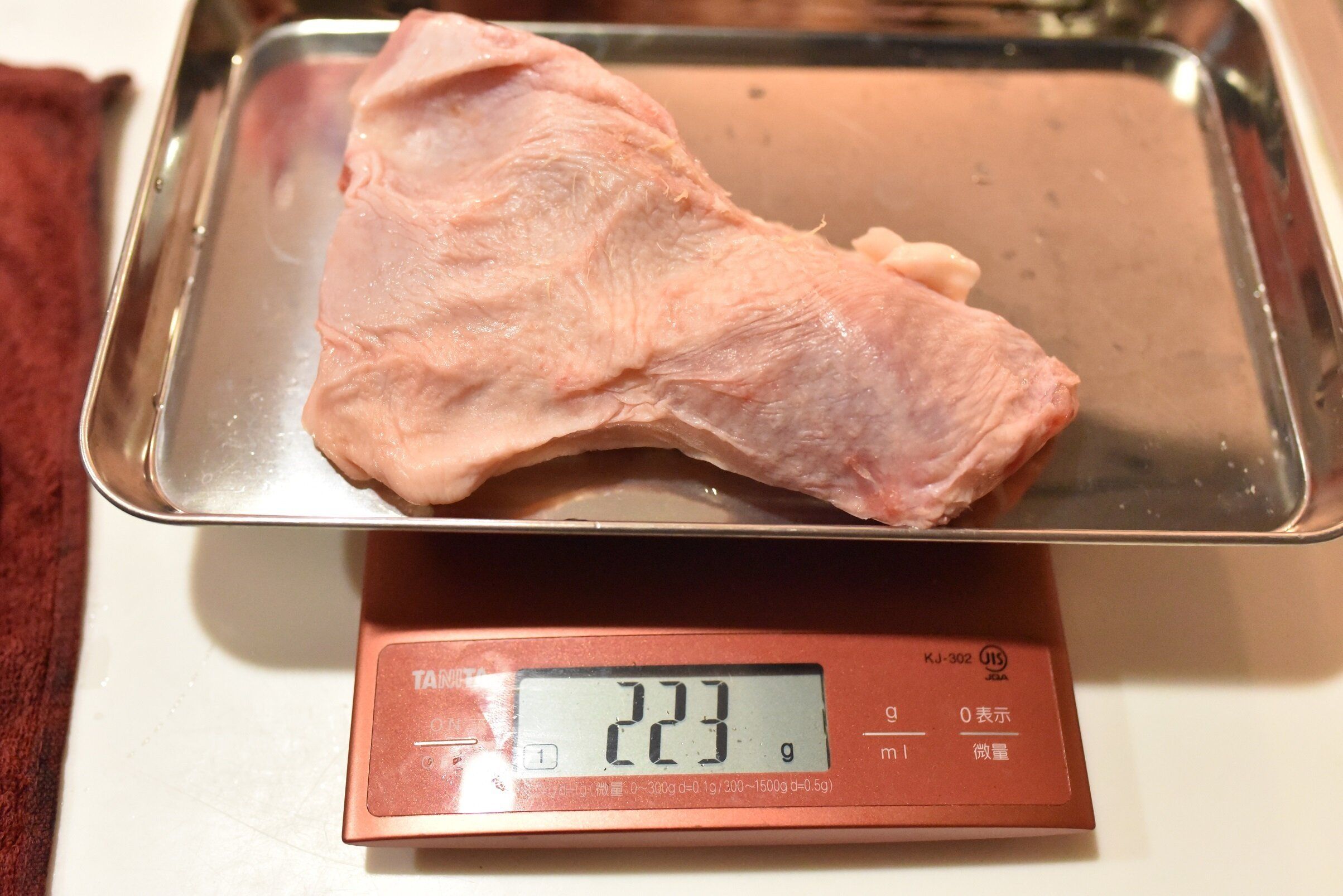 1日~1日半冷蔵庫に入れておくと、半解凍の状態(柔らかくはないが、2kgの固まりになっている状態から1枚1枚に分けることができる状態)になります。この状態だとドリップがたれることがないので、切り分けるのにおすすめのタイミングになります。