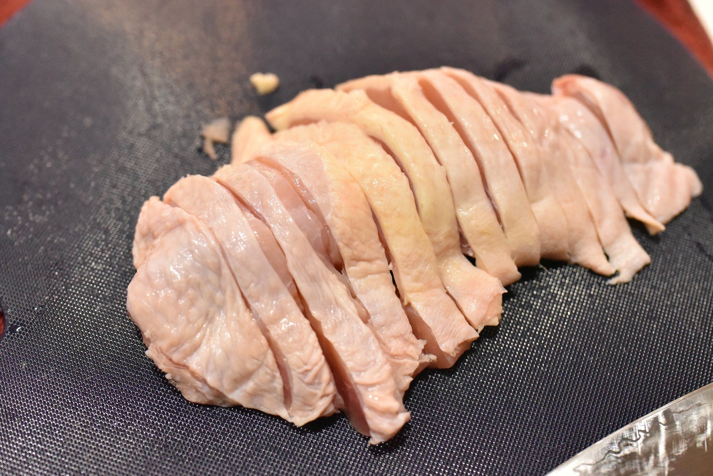 サクサクっとハムのように切れるので、柔らかい状態では切りにくい鶏肉をスライスするのも簡単です。