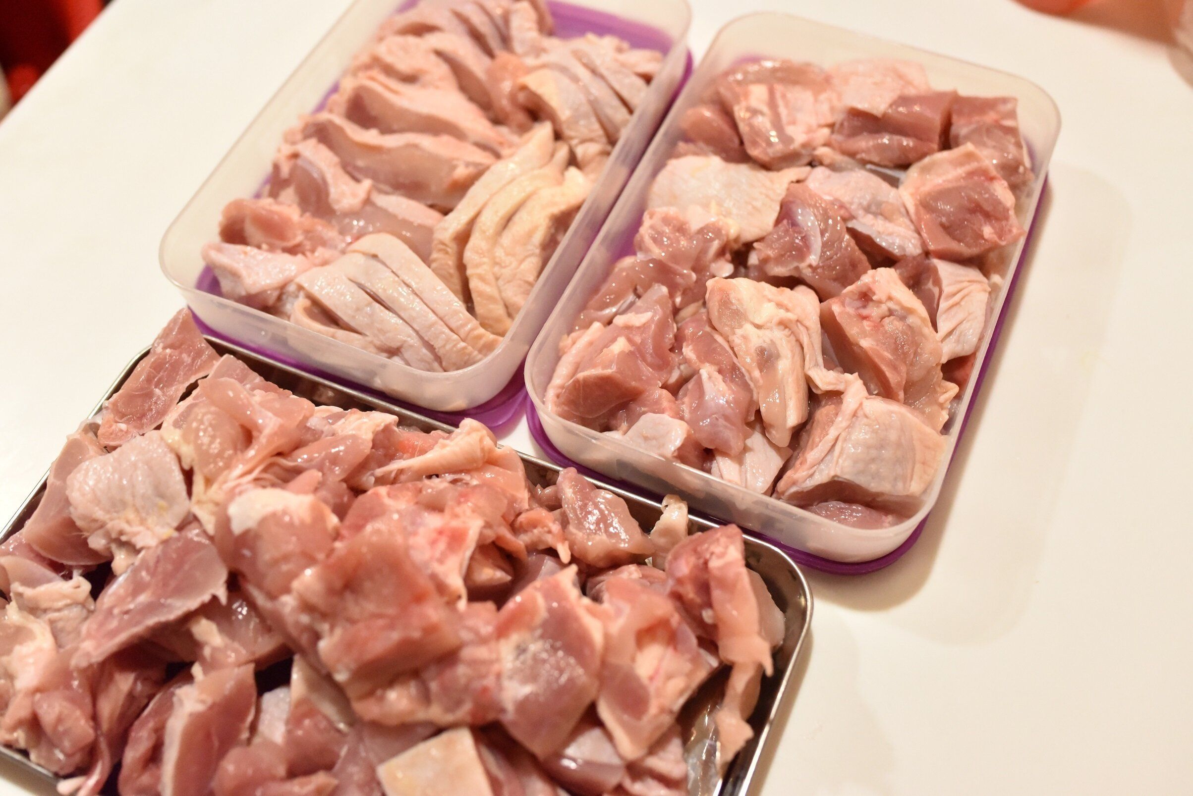 今回は、2枚分をスライスして、炒め物用に。3枚をカレー用にぶつ切りに。4枚を唐揚げ用にぶつ切りにしました。