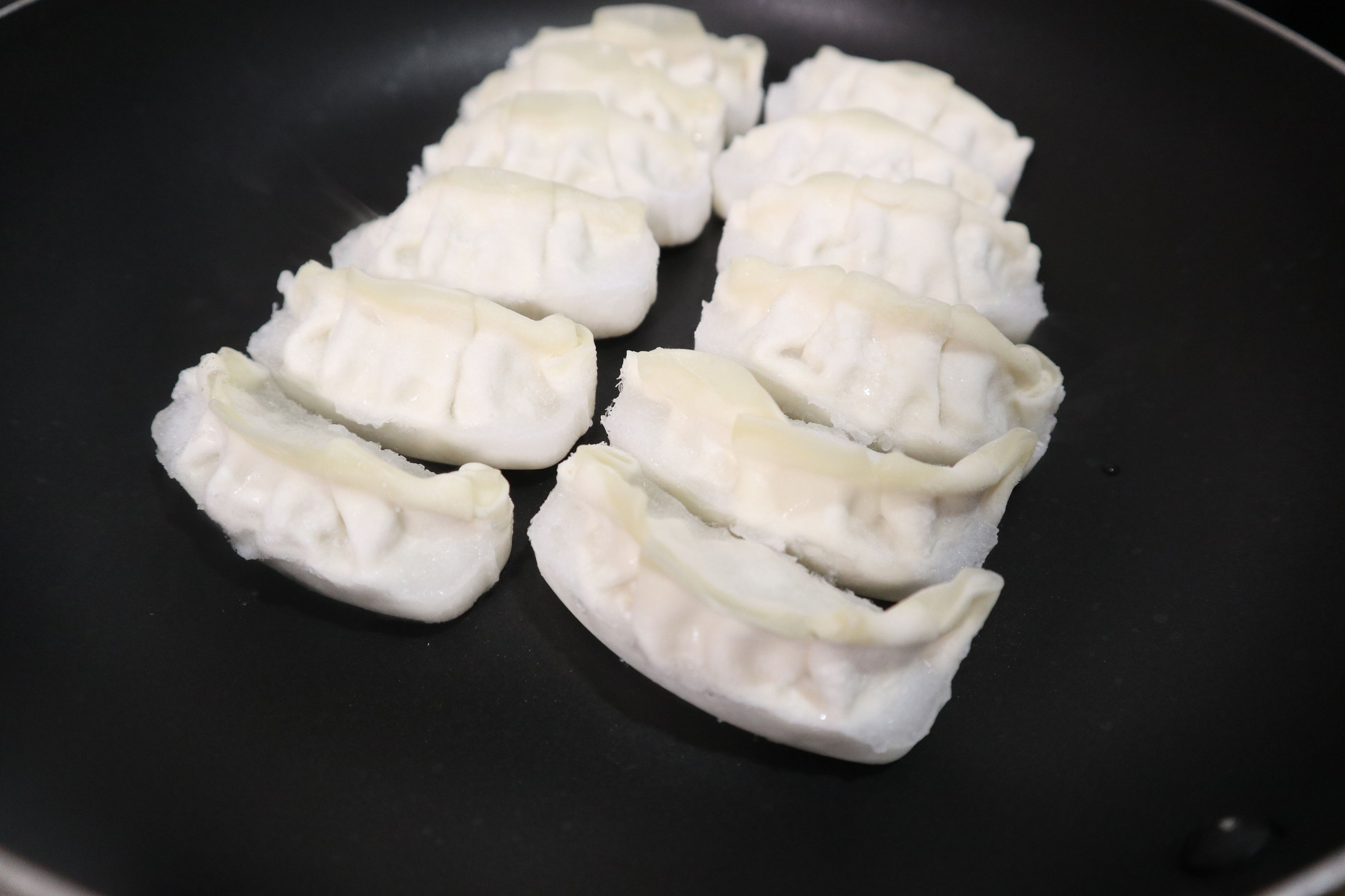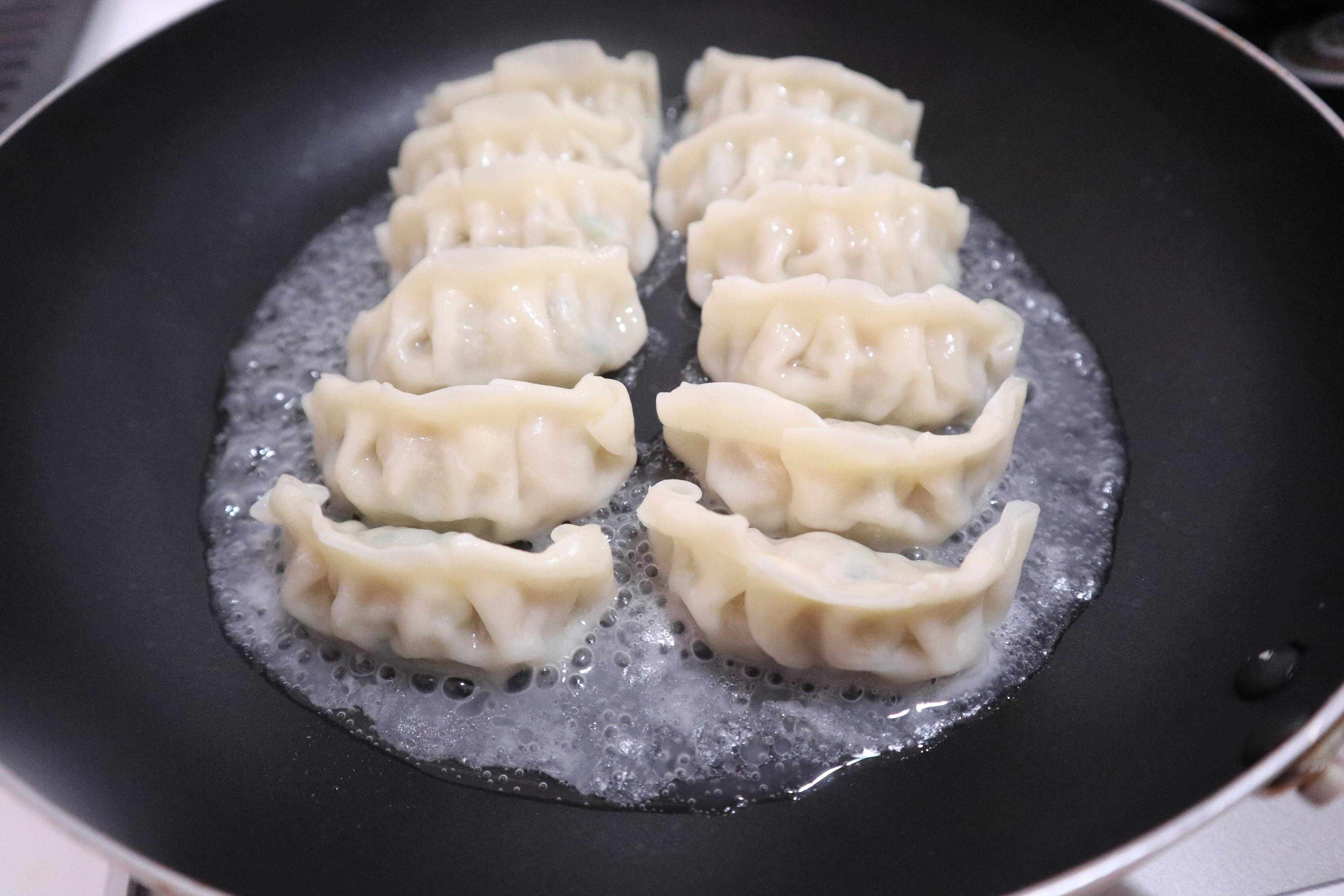 この餃子は、焼くのもとても簡単!フッ素加工のはがれていないフライパンを使えばだれでもキレイに焼けます。