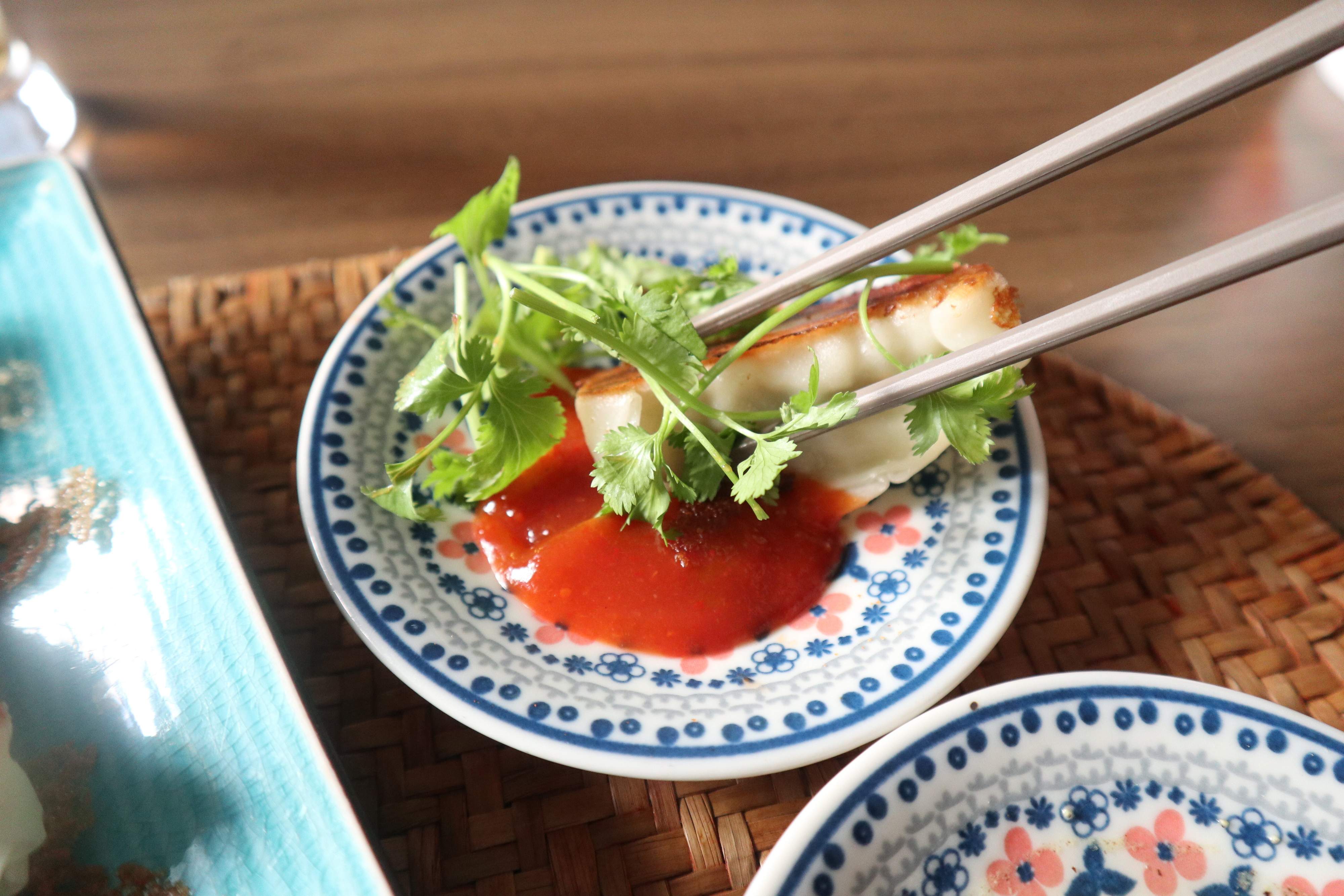 お好みのつけダレで餃子を楽しむ。おすすめは、酢とブラックペッパー。
