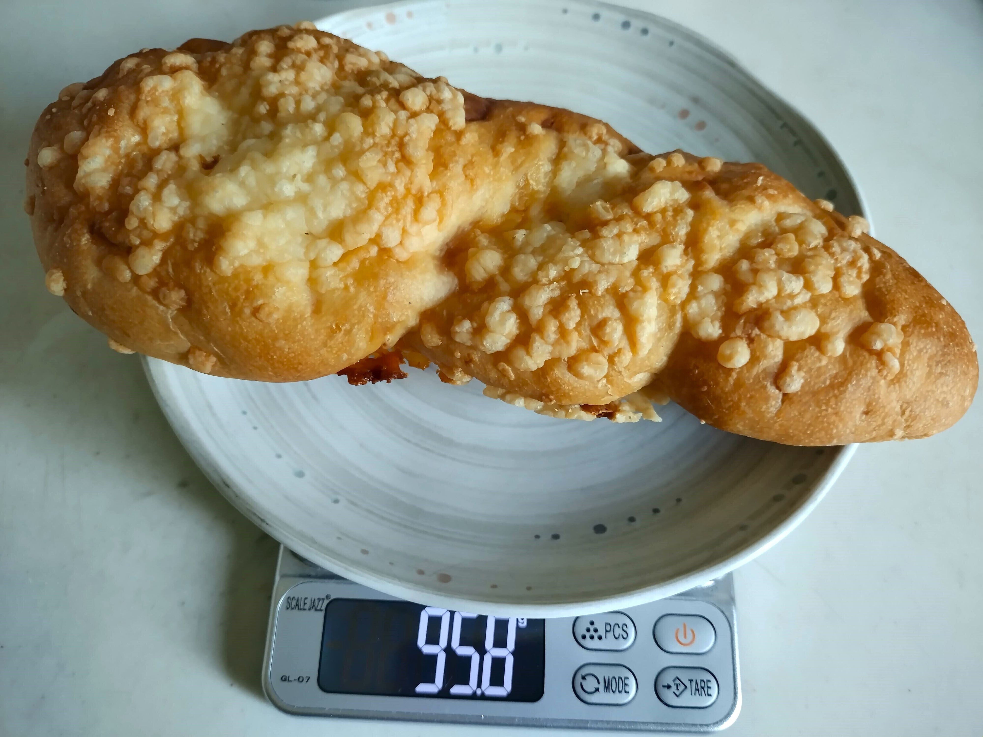 1つ重さを測ってみたところ、95gほどでした。1つあたり234kcalくらいと考えるとよいかなと思います。とても大きくて食べ応え抜群なので、もっと高カロリーかと思いましたが、おにぎりよりちょっとカロリーが高いくらいです。