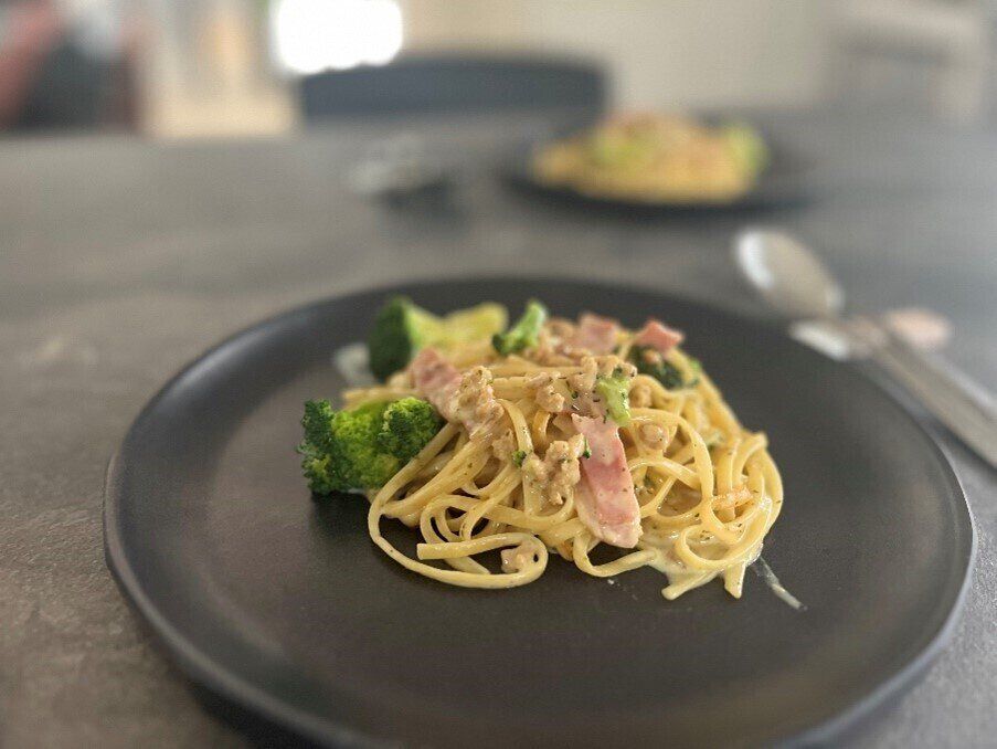 カルボナーラにあまったベーコンとブロッコリーを足してみました。育ち盛りの子どもの軽食にもピッタリ!