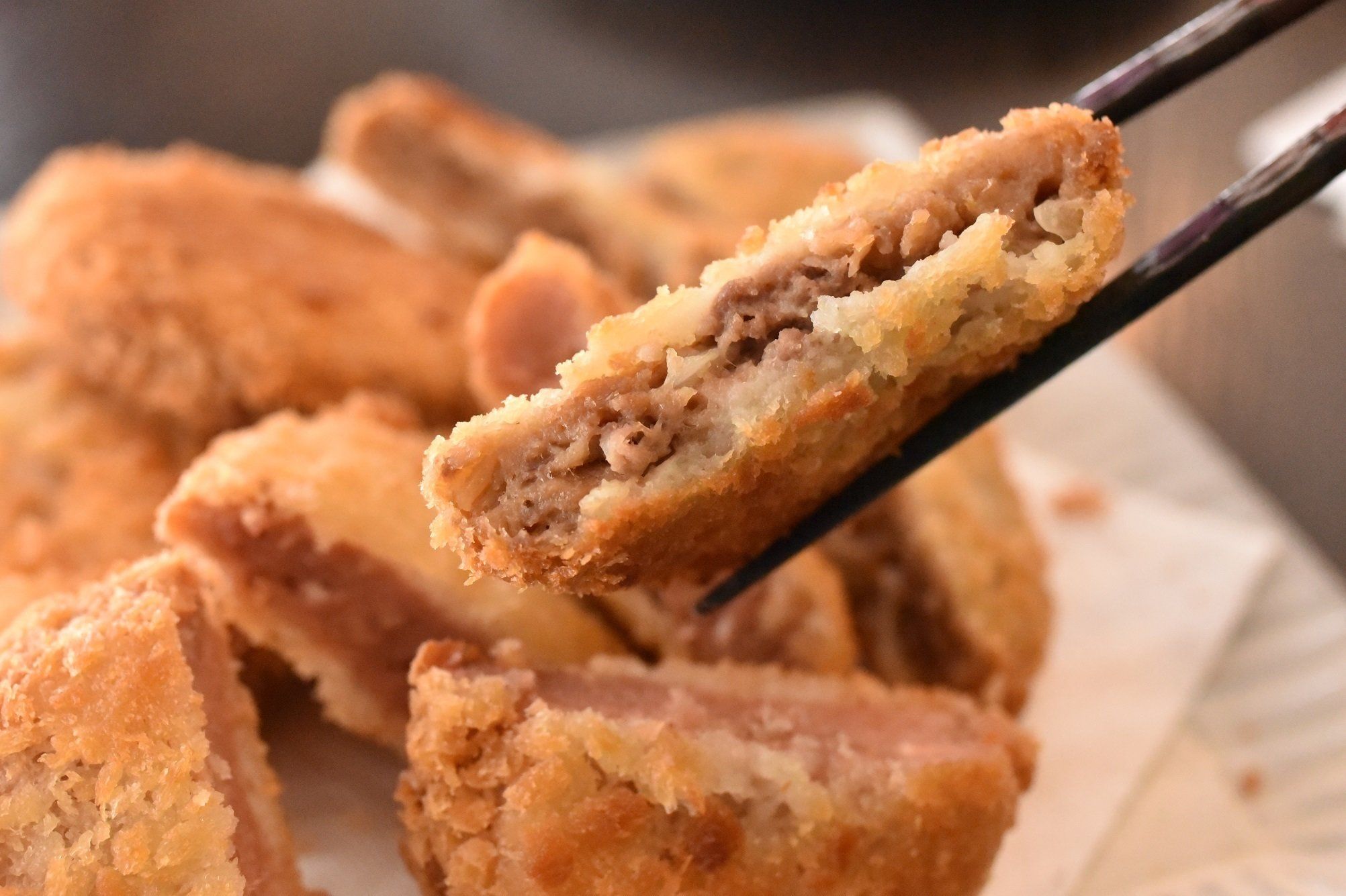 ハムをつくってからカットしてカツにしているのではなく、ミンチ肉を衣で包んでいる形状になっています。厚みがあるので歯ごたえがあり、肉らしい食べ応えがあります。
