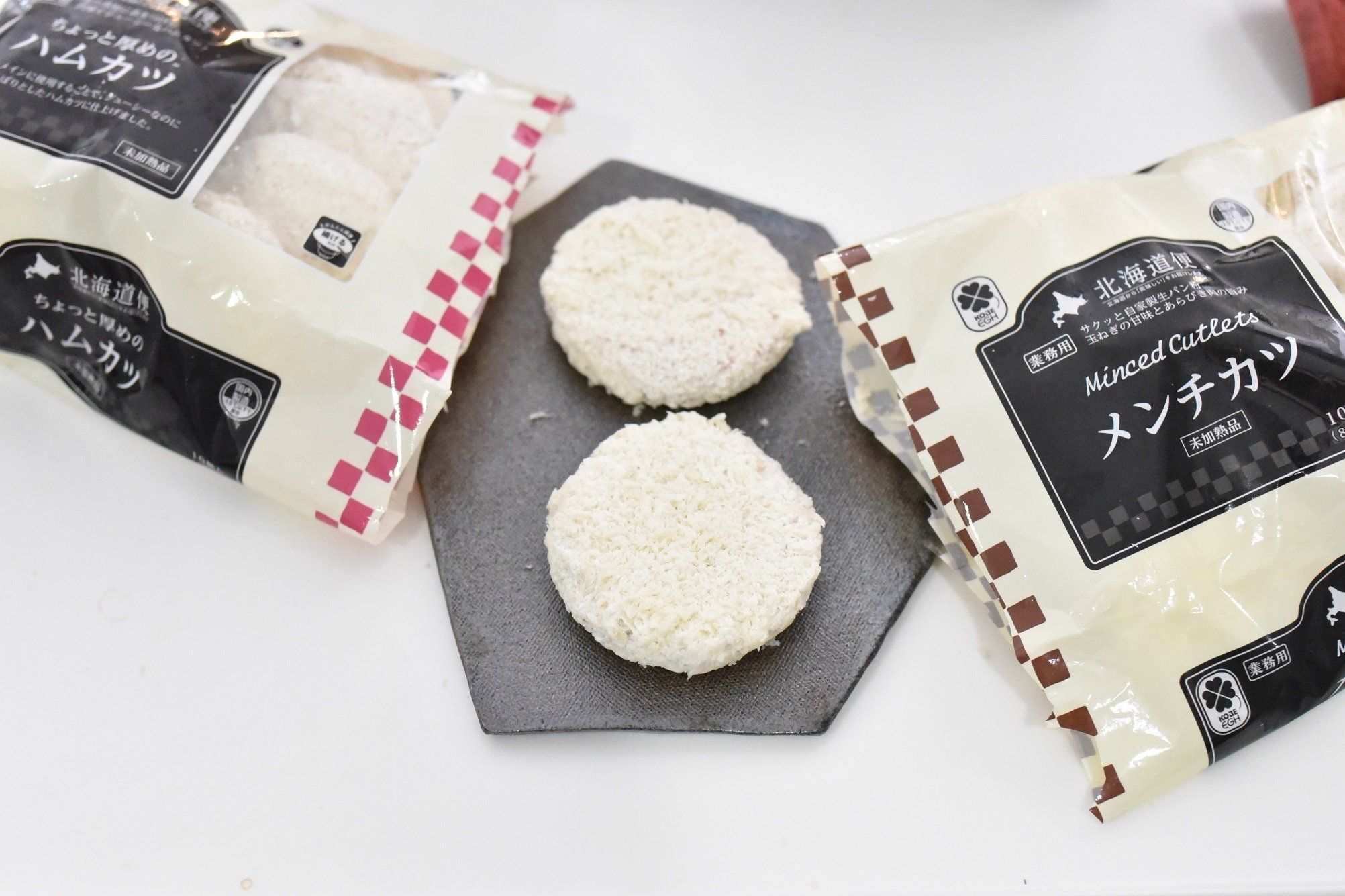 メンチカツもハムカツも、揚げる前の形はほとんど変わりません。メンチカツは、10個入りで248円なので、1個約25円。ちょっと厚めのハムカツは10個入りで325円なので、1個約33円ととてもリーズナブルな商品です。