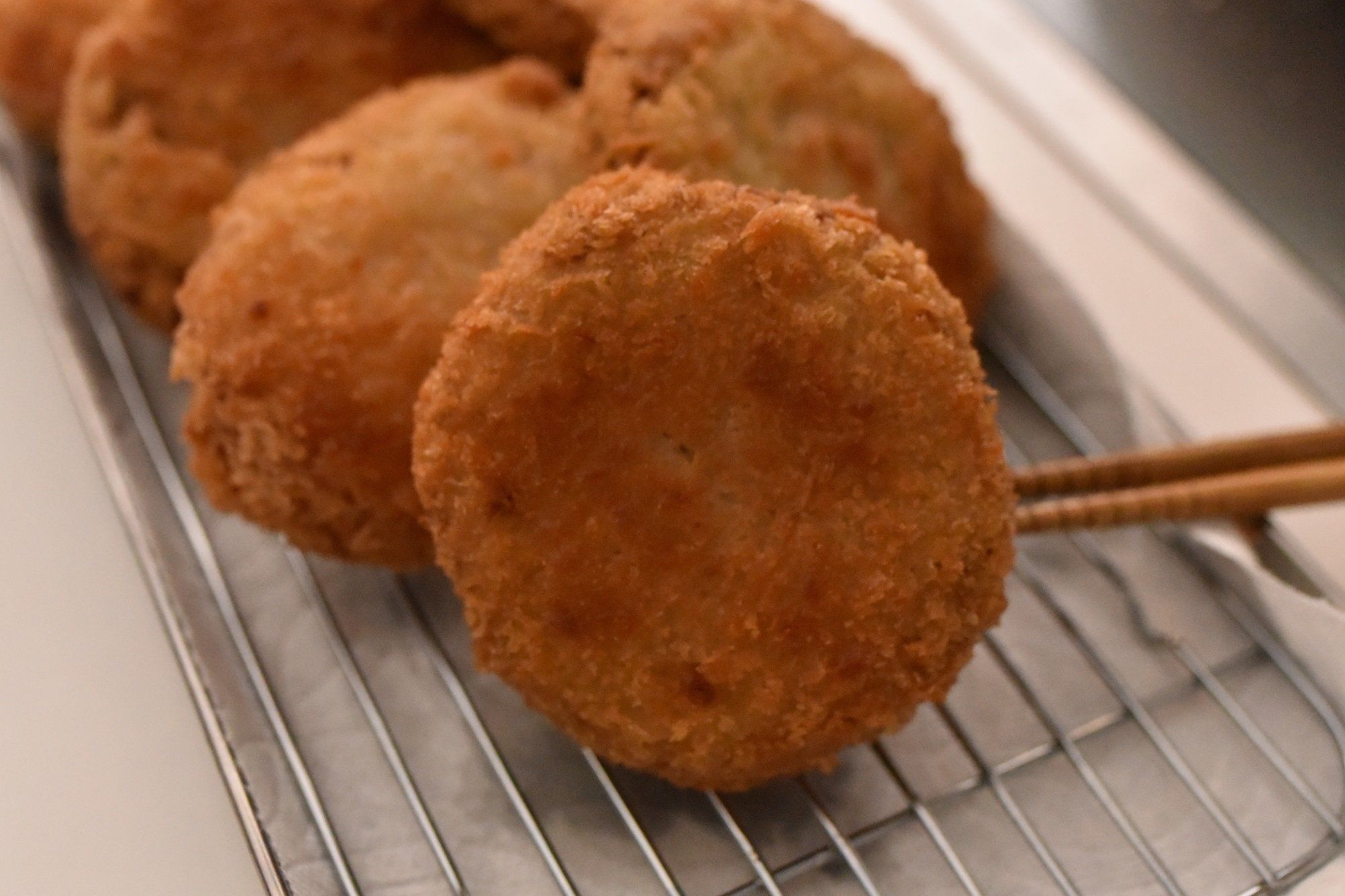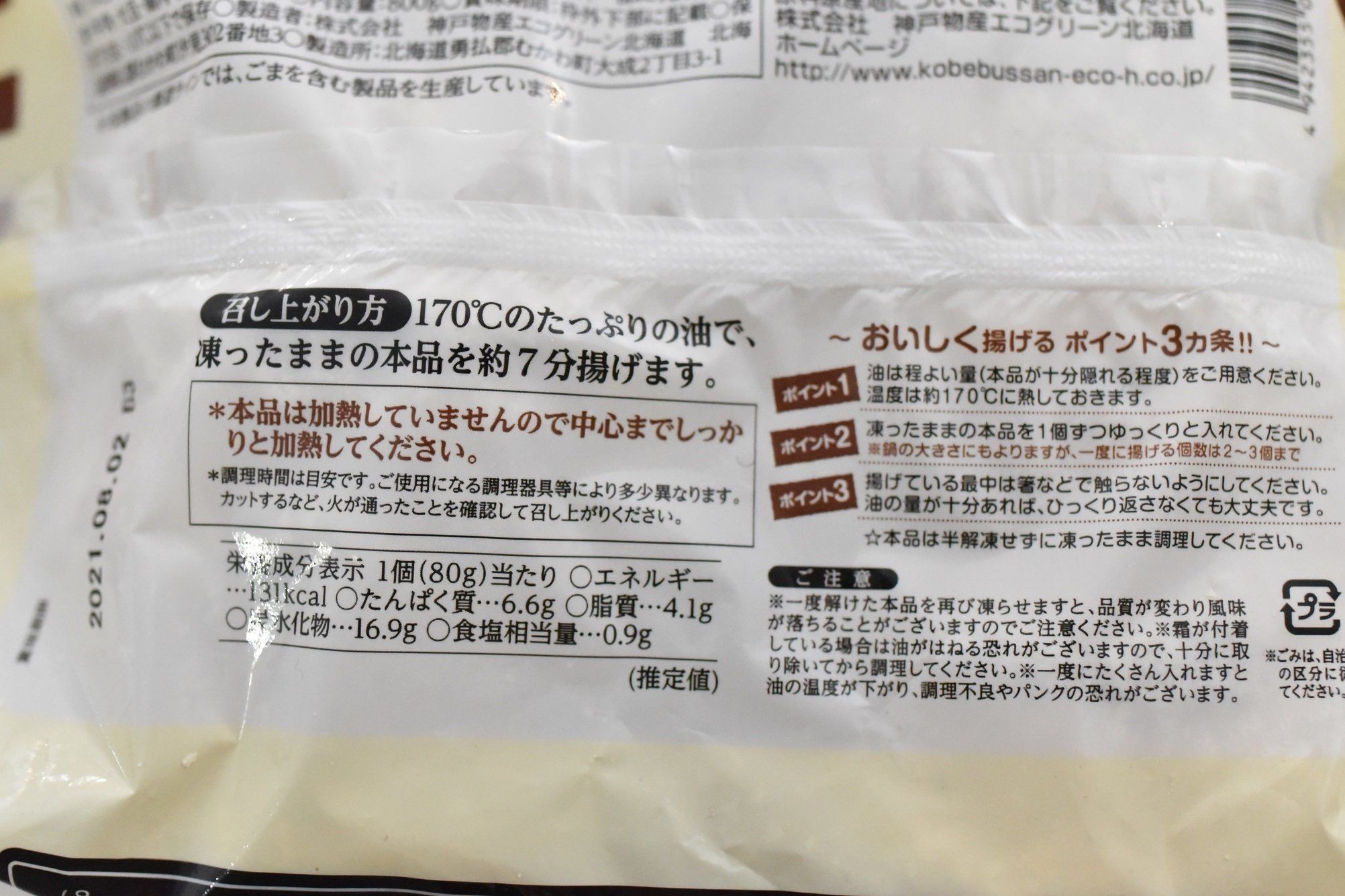 両方とも非加熱商品ですので、170℃の油で7分揚げてからお召し上がりください。片面にしっかりと揚げ色がつくまで揚げてから反転させると、型崩れさせずに揚げることができます。