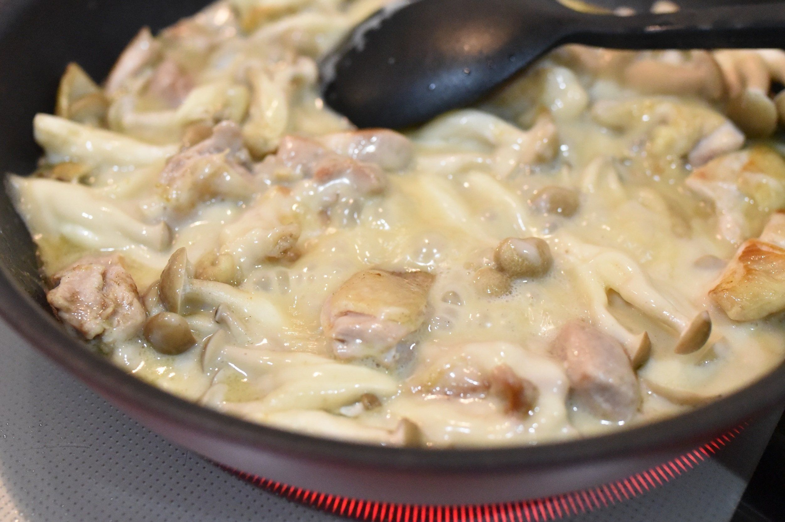 主な材料は鶏もも肉としめじ。塩コショウをして焼いて、ホワイトソースを加えるだけで完成します。ホワイトソースにはしっかりと味がついているので、もも肉とキノコへの味つけは薄味で大丈夫です。